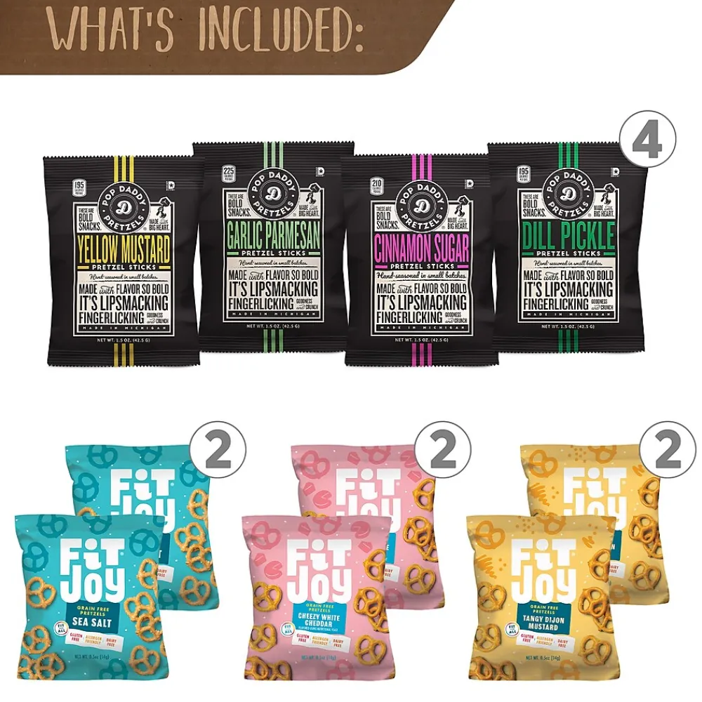 - Includes brands like Dot’s, Snyders, Pepperidge Farms, Combos, Fit Joy and Pop Daddy for a total of 38 individual bags of pretzel goodness