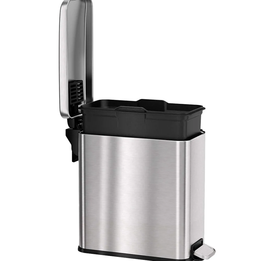 | Handles Trash can or recycling bin features. For example: molded hand grips, wide rim, step on, touchless | Fingerprint-resistant coating, smudge-resistant, replaceable air damper, AbsorbX technology |