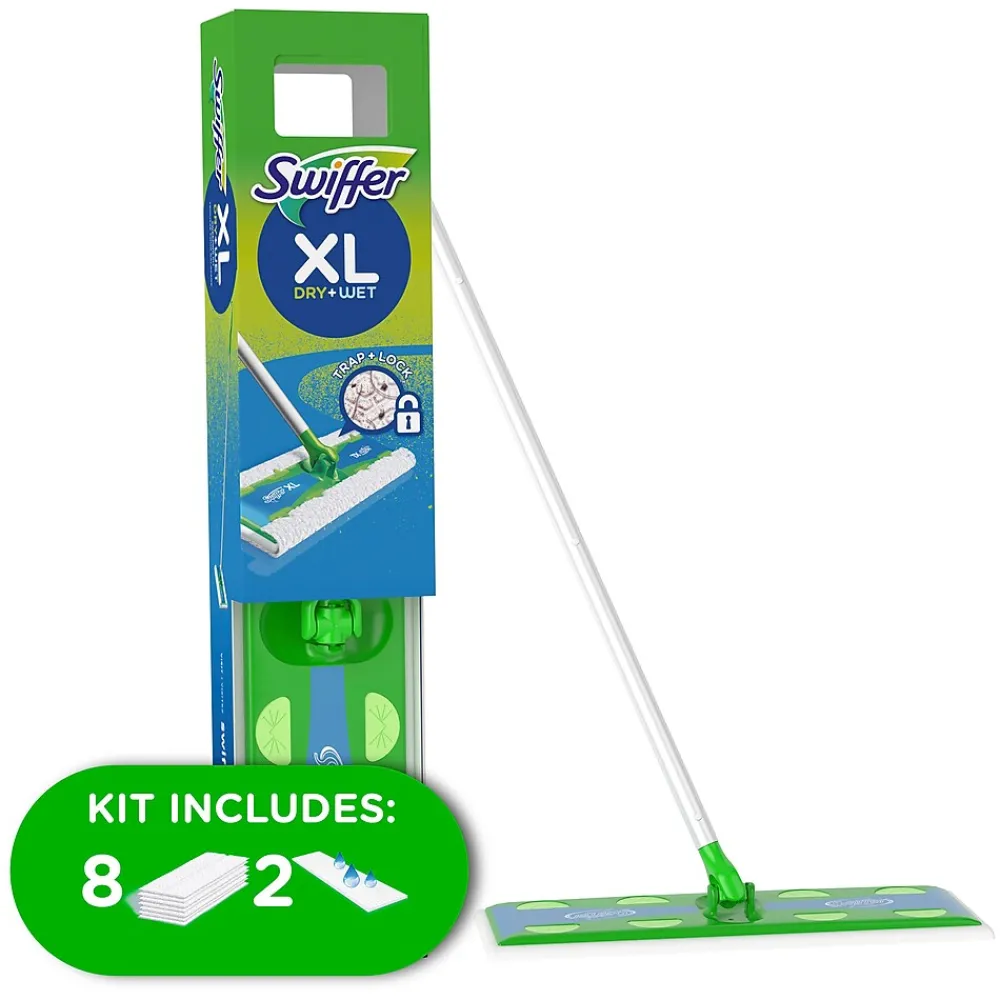 The Swiffer® 92816 green floor mop starter kit makes cleaning large areas quick and easy. Kit contains X-large sweeper, 8 dry sweeping refills and 2 wet mopping refills. It traps and locks even more dirt, dust and hair with each swipe. The 24″ ergonomic handle with easy grip, is made of aluminum for enhanced durability. The 360 deg swivel head cleans dirt even in hard-to-reach places.