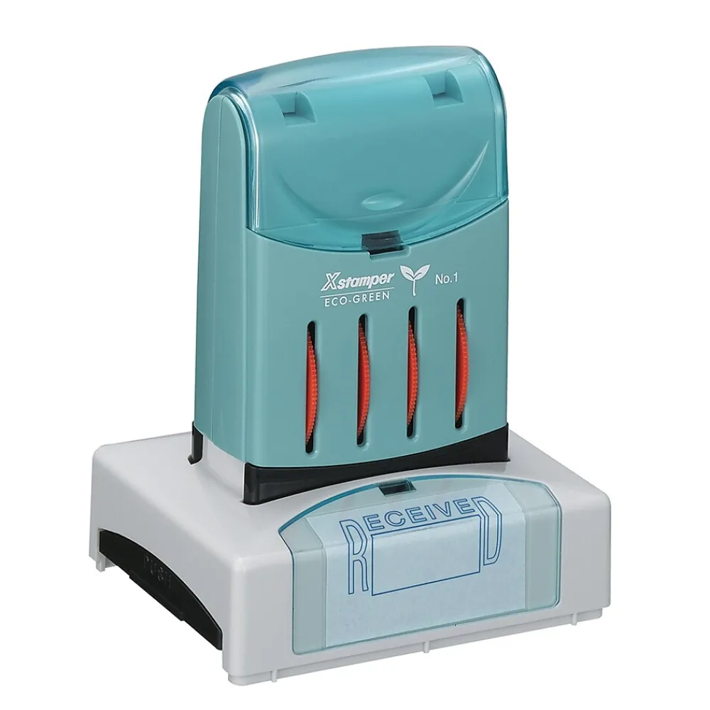 Clearly mark invoices, forms, and other important documents with this red and blue RECEIVED stamp, which features a date box for detailed tracking. This Xstamper NO.1 stamp converts to a date-only stamp by removing the RECEIVED message frame for more flexible use.