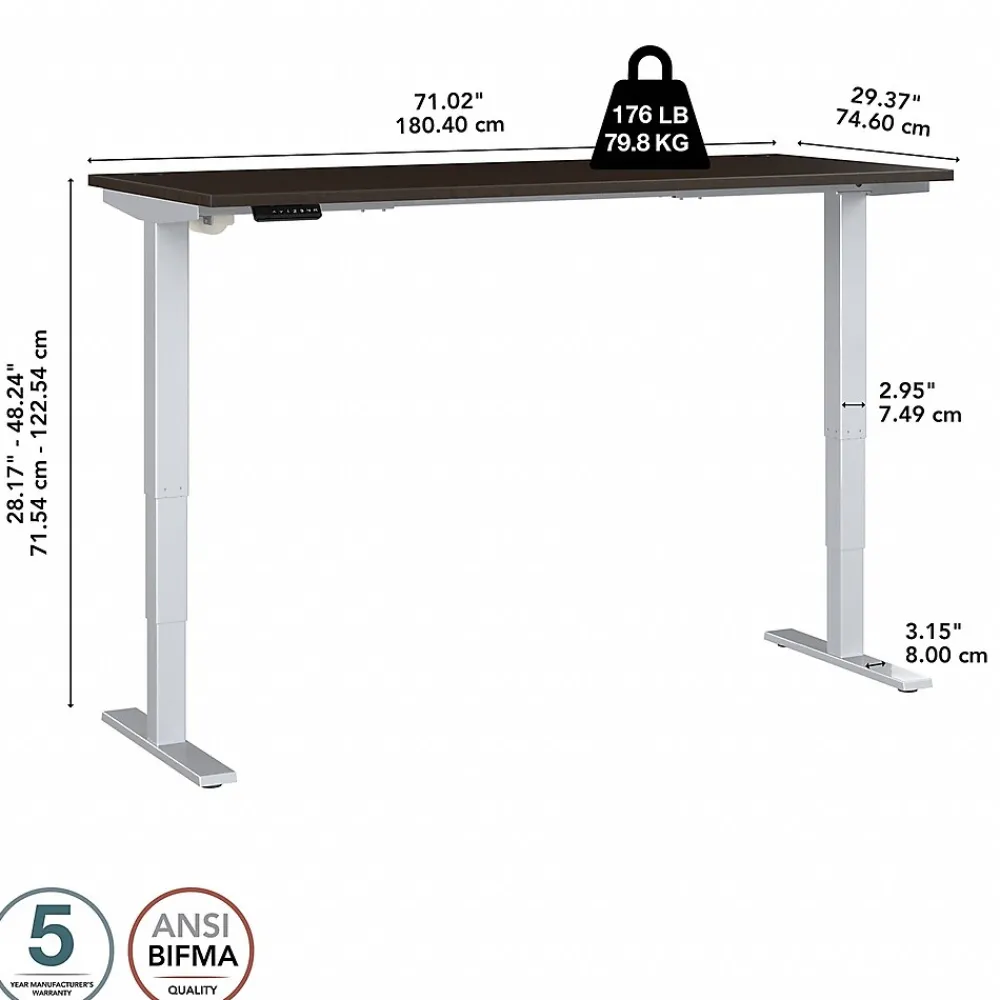 Bush Business Furniture’s Move 40 Series Electric Height Adjustable Standing Desk is a perfect way to build an ergonomic workspace without the high-end price tag. The 72W x 30D desktop lifts anywhere from 28 to 48 inches from the floor at a speed of 1.25 inches per second. The control panel includes four programmable presets that save your favorite heights so you can change positions without missing a beat. The Adjustable Desk also features an Anti-Collision Sensor that stops movement up or down if an object is detected. Built to endure the rigors of a busy professional environment, the thermally fused laminate work surface resists scratches and stains while a welded 16-gauge steel base allows the desktop to support up to 176 pounds. This Ergonomic Office Desk has been tested to meet or exceed ANSI/BIFMA standards for safety, durability and performance and is backed by a 5 Year Warranty.