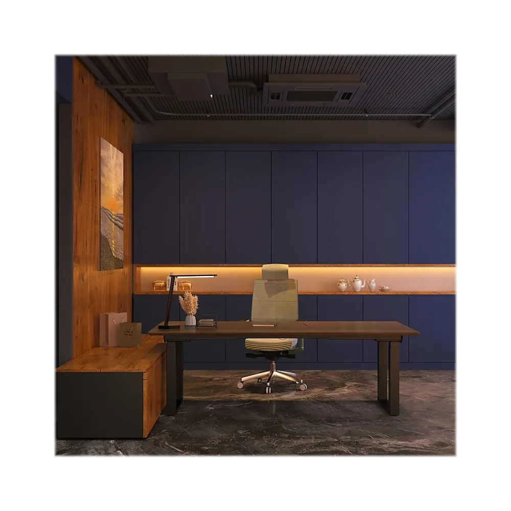 The FlexiSpot E7Q Odin executive desk is a great solution for small conference rooms, huddle rooms, and collaboration areas. It also makes an amazing home office desk. The E7Q features a four-motor height-adjustable base that can support up to 440 lbs. The desk’s holeless columns are not only attractive but prevent the buildup of grease on the moving stages. The anti-collision feature reverses the direction of the desk if an object is struck during movement.