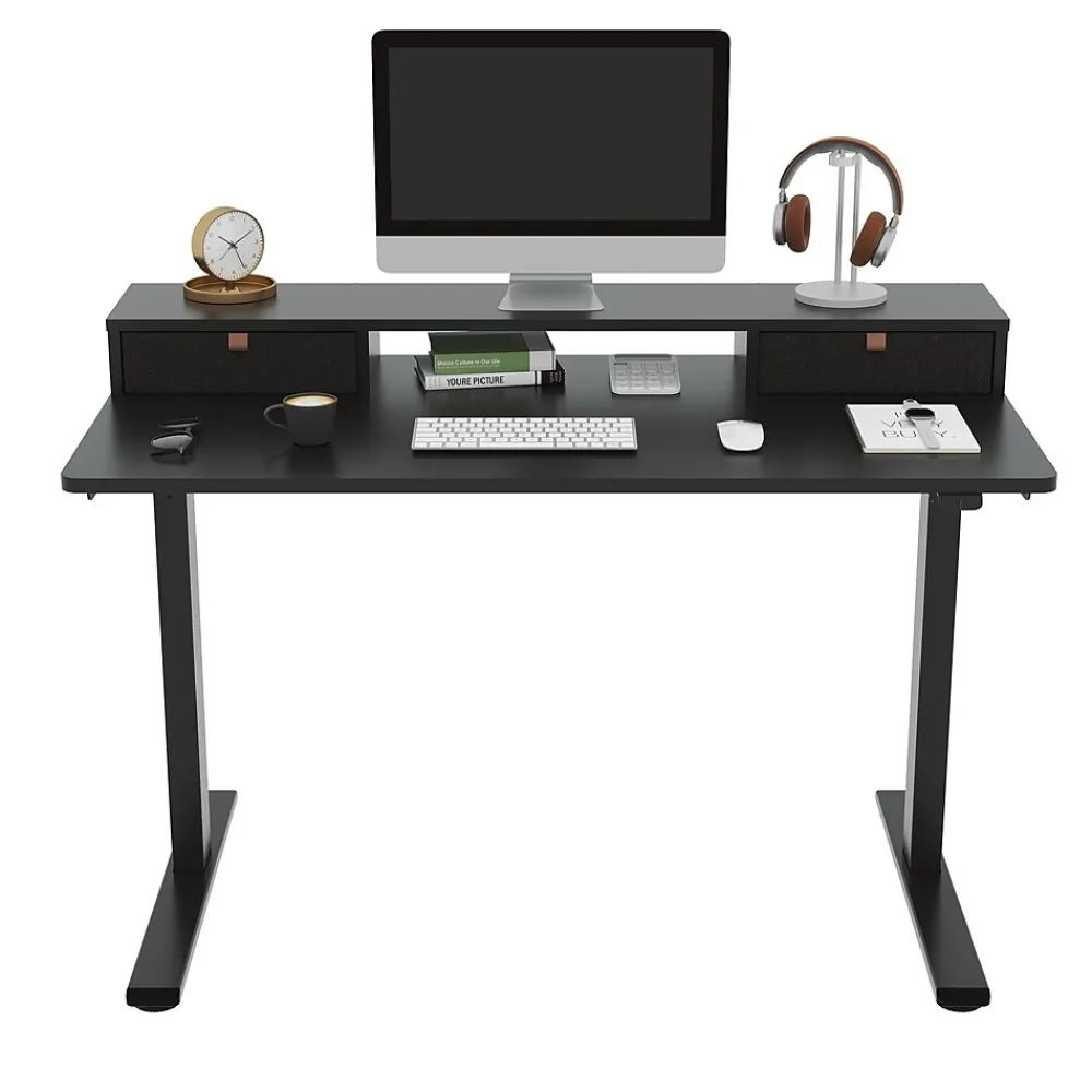 - A separate shelf with 2 fabric drawers are included. The shelf/drawer system rests on the top and does not get permanently installed to the desktop