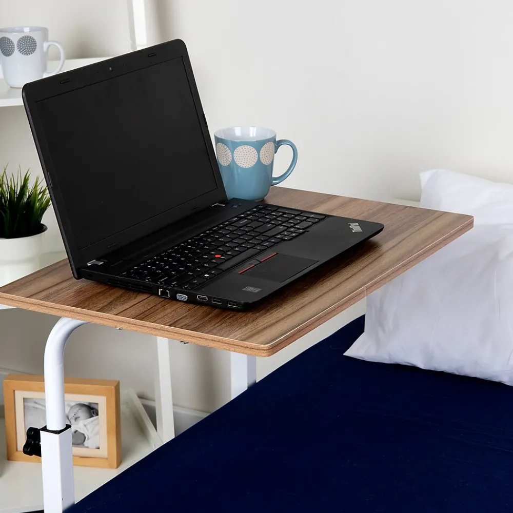 Elevate your workspace, working lunches and enhance your comfort with this over bed laptop desk. Say goodbye to awkward folding tables or hunching over low coffee tables, and welcome a sleek, convenient end table that easily pivots into a versatile surface for working, eating, or even reading. Its adjustable height levels make it perfect for use over the arm of a couch or over a bed.Designed to fit cozily alongside your couch, bed, or armchair, this unique desk features four wheels for easy maneuvering, and locking levers to keep it in place while you work or eat. The low-profile base fits seamlessly under a couch or bed frame, allowing you to adjust the table’s position for optimal comfort. The stable woodtone surface supports your laptop or plate, making work or dining a breeze.Upgrade your working or lunchtime experience with this adjustable height overbed desk, and enjoy comfortable, efficient working or dining anywhere in your home.