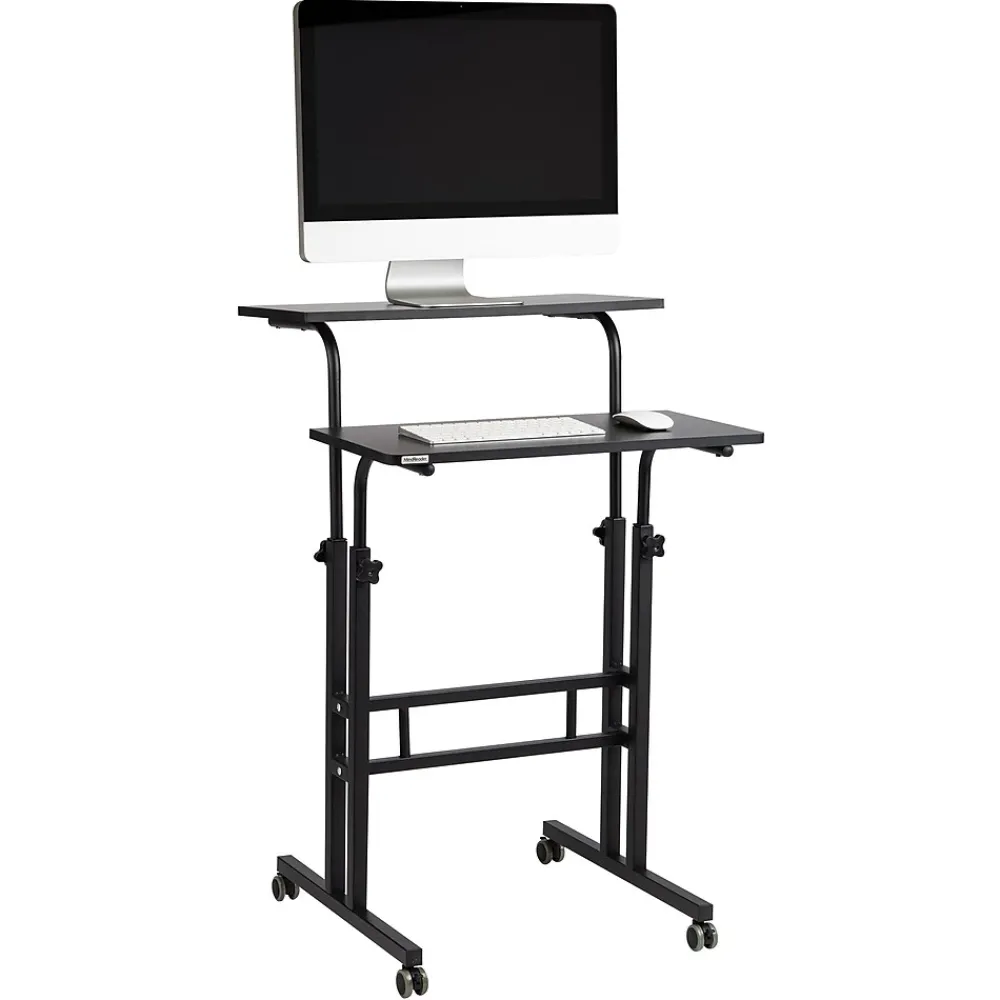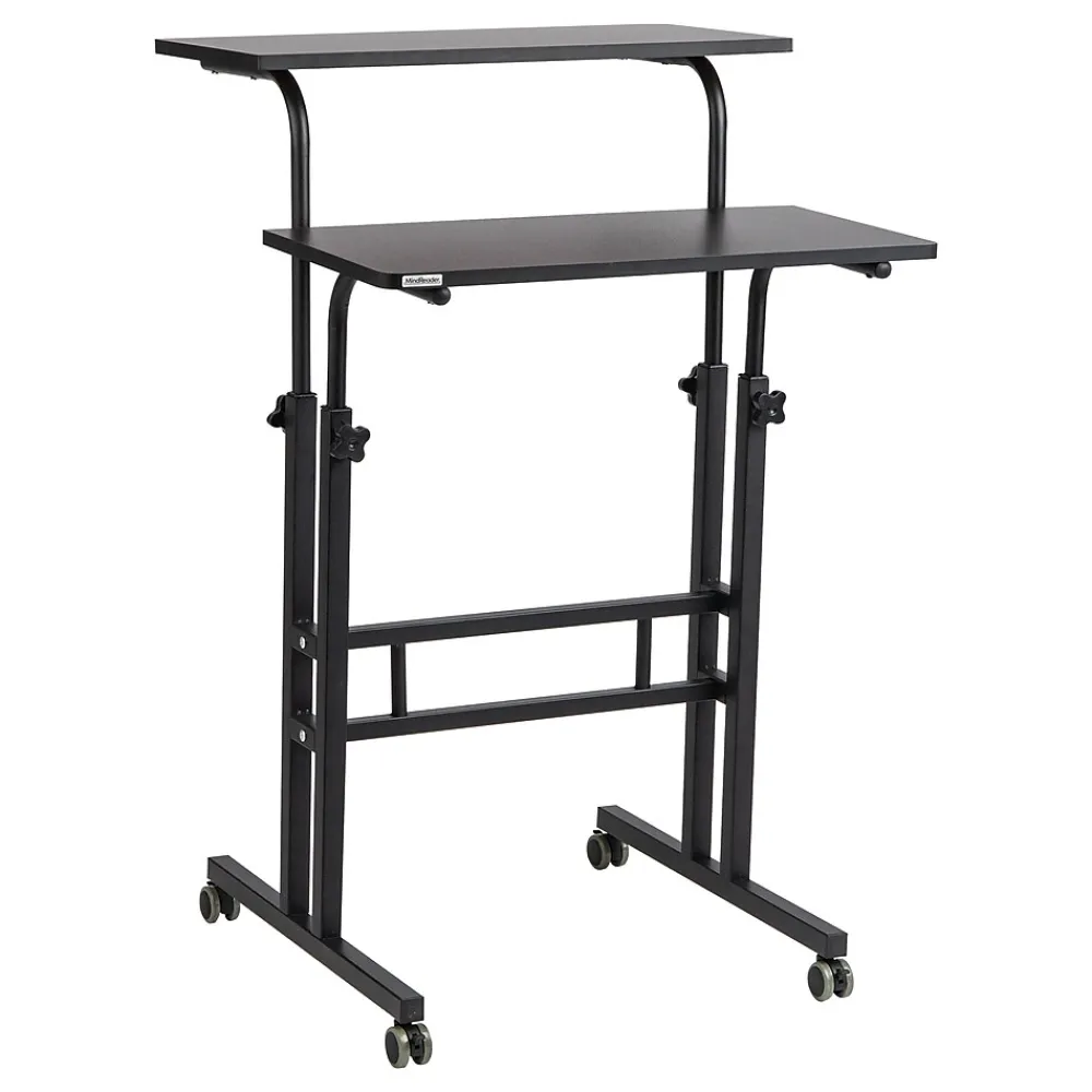 This versatile workstation adapts to your workday and lifestyle. This innovative two-tiered desk offers the flexibility to sit or stand while working and provides ample space for other items. The adjustable desktop allows you to work at the perfect height, making it ideal for a variety of tasks.Despite its sturdy construction, this mobile desk is easy to move, thanks to the four lockable casters. With dimensions of 23.5 inches long, 19.5 inches wide, and an adjustable height of up to 39 inches, this desk is perfect for any work or study space.Made of durable MDF and steel, the Mobile Sit/Stand Desk is built to withstand daily use and is easy to clean with a soft cloth and mild soap. A thoughtful gift for college students or remote workers, this flexible workstation is the perfect addition to any home or office.Embrace a dynamic work lifestyle with the Mobile Sit/Stand Desk – your one-stop solution for a comfortable and efficient workspace.