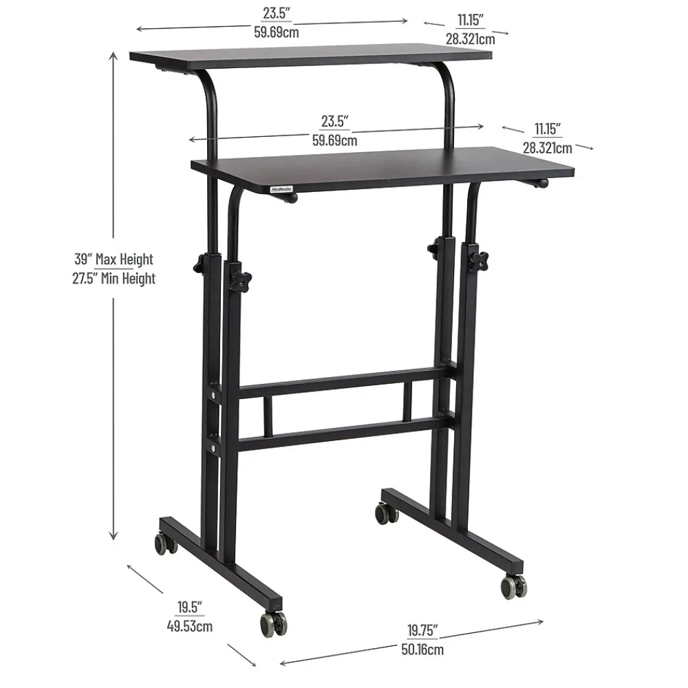 - Dimensions: This mobile desk measures 23.5 long x 19.5 wide x 27.5-39 inches tall (59.69 x 49.53 x 69.85-99.06 cm)
