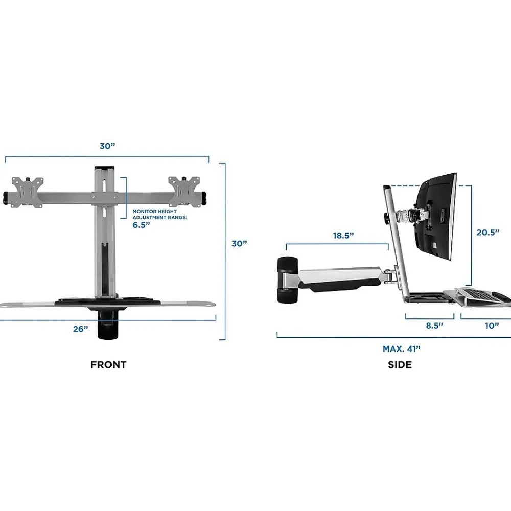 Change from sitting to standing in seconds with the full motion, wall-mounted workstation. The heavy-duty spring arm uses counter-balance technology. This allows you to only need to set it once to the optimal tension, and then you will be able to effortlessly move your sit-stand up to 19.9 inches for the desired height. The dual screen VESA bracket works with monitors up to 27 inches and can be tilted for the optimal viewing angle.The wide keyboard is 26.2 inches (length) by 10.2 inches (depth) and it conveniently folds away when you don’t need it.The workstation also features an organizer tray, built-in cable management ducts, and a bonus wall-mountable, CPU holder for a complete standing computer station.