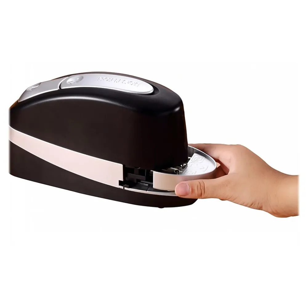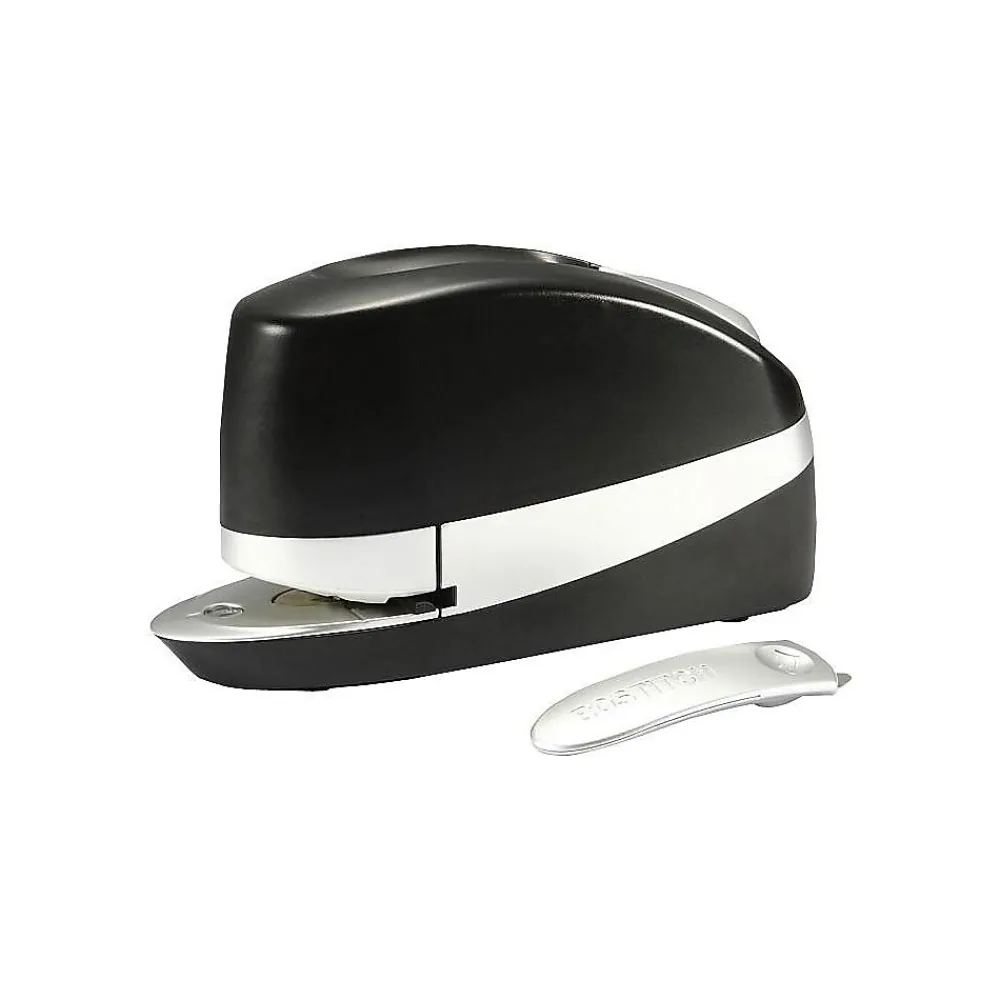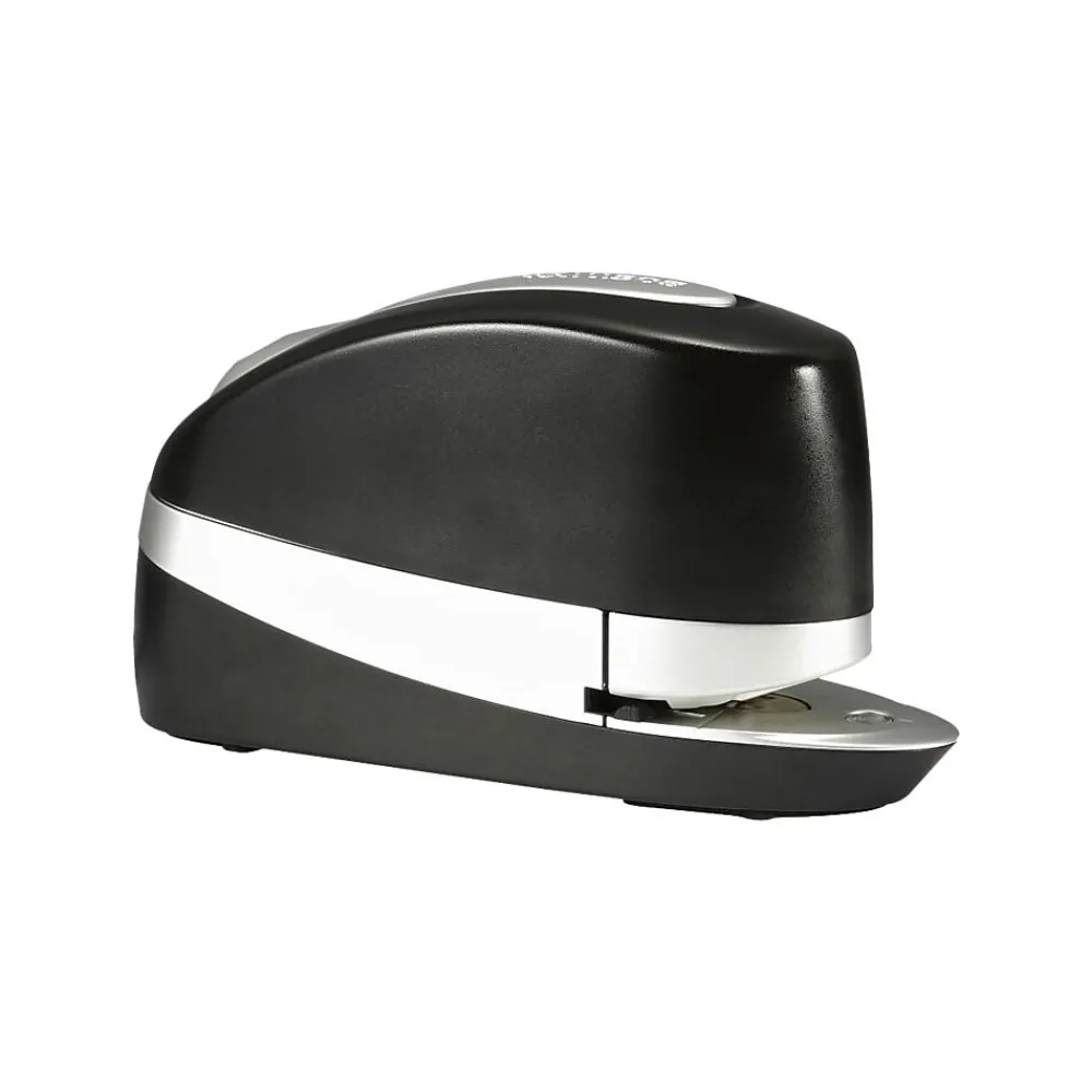 Expand your stapling horizons with speed and style. This attractive electric stapler is packed with all the necessary features. Optical trip firing mechanism provides fast stapling and Anti-Jam floating core eliminates frustrating staple jams. Extra wide lead-in and adjustable paper stop ease the stapling experience and help place the staple exactly where needed. Will staple at normal right angle or at 45 degrees. Stapling tray holds an additional four strips of staples