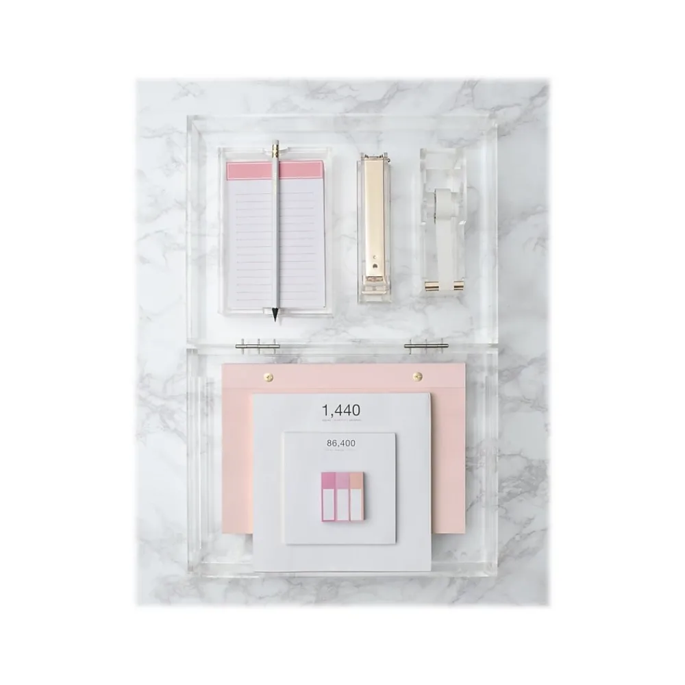 Heavy-cast clear acrylic combined with gold-toned hardware will lend a minimalist, contemporary aesthetic to your work desktop or home decor. The elegance and durability of this acrylic stapler are sure to enhance any workspace. The stapler features an easily refillable track and is designed to work with standard-size staples.