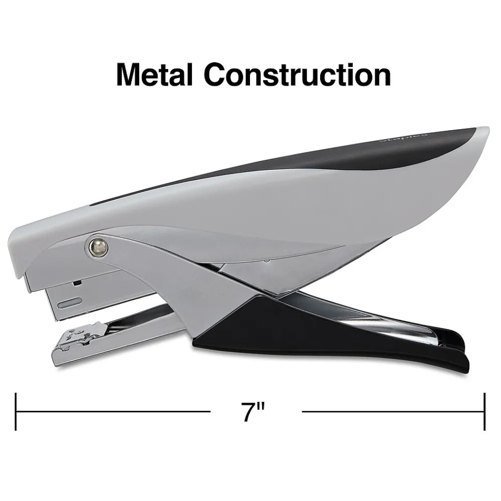 Handle every collation task with this deluxe stapling-plier stapler. The soft, contoured handles provide the comfort needed for repeated use, while the gray-and-black coloring offers a sleek, professional look. This Staples stapling-plier stapler has a unique hand-held shape that reduces fatigue while increasing stapling control, helping ensure high-quality results each time, while the all-metal construction protects it from wear and tear.