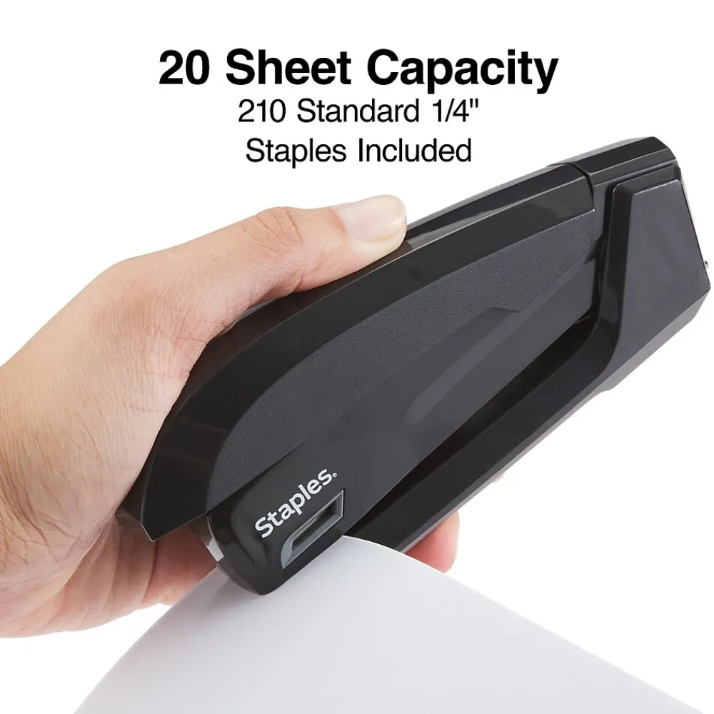 Complete your workspace with this desktop stapler. The One-Touch operation makes it easy to fasten stacks of documents in one pass, and the 20-page capacity makes this stapler a versatile paperwork handling tool. A clear viewing window lets you see current staple levels, so you know when it’s time to add a new strip. This Staples One-Touch stapler features a gently curved design for added comfort.