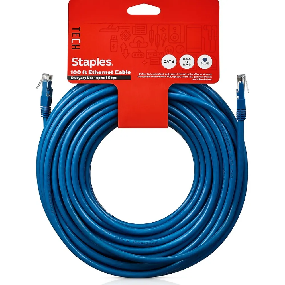 Connect high-speed network devices – like modems, PCs, laptops, smart TVs, gaming consoles and more – with this Staples TECH Ethernet cable. The 50-foot cable provides extra length to connect from across the room, while the CAT 6 configuration offers data transfer speeds up to 10Gbps for fast performance. This Staples TECH CAT 6 Ethernet cable has snag-free RJ45 connectors for an efficient and stable signal between compatible devices. Backed by Staples Brands 100% satisfaction guarantee, or your money back.
