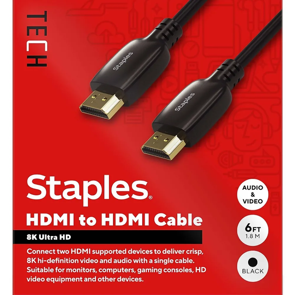 Delivering crisp 8K Ultra HD resolution this HDMI cable promises clear audio and video for an exceptional experience. Featuring a compact 6-foot cord, this cable will reduce cord clutter while giving you ample length to connect devices across your work or entertainment station. This cord is the perfect choice for outfitting your work, gaming or media space. Enjoy high resolution audio and video between devices so you can upgrade your home or office workspace and do your best work. Backed by Staples Brands 100% satisfaction guarantee, or your money back.