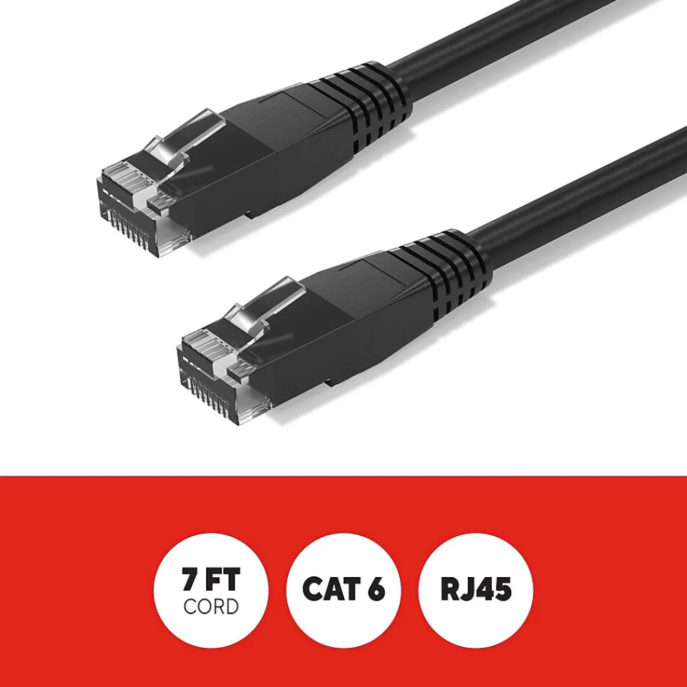 Connect high-speed network devices – like modems, PCs, laptops, smart TVs, gaming consoles and more – with this Staples TECH Ethernet cable. The 7-foot cable is compact to reduce cord clutter, while the CAT 6 configuration offers data transfer speeds up to 10Gbps for fast performance. This Staples TECH CAT 6 Ethernet cable has snag-free RJ45 connectors for an efficient and stable signal between compatible devices. Backed by Staples Brands 100% satisfaction guarantee, or your money back.