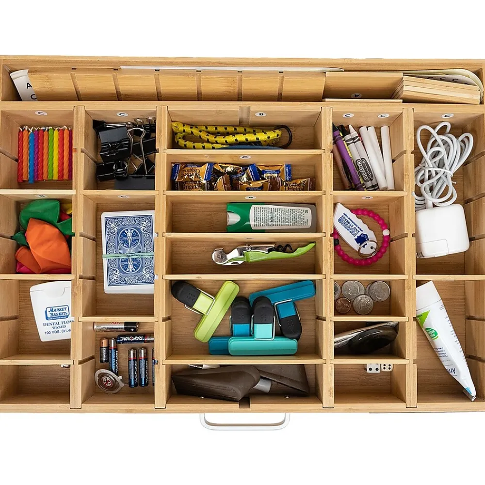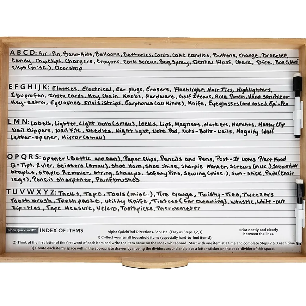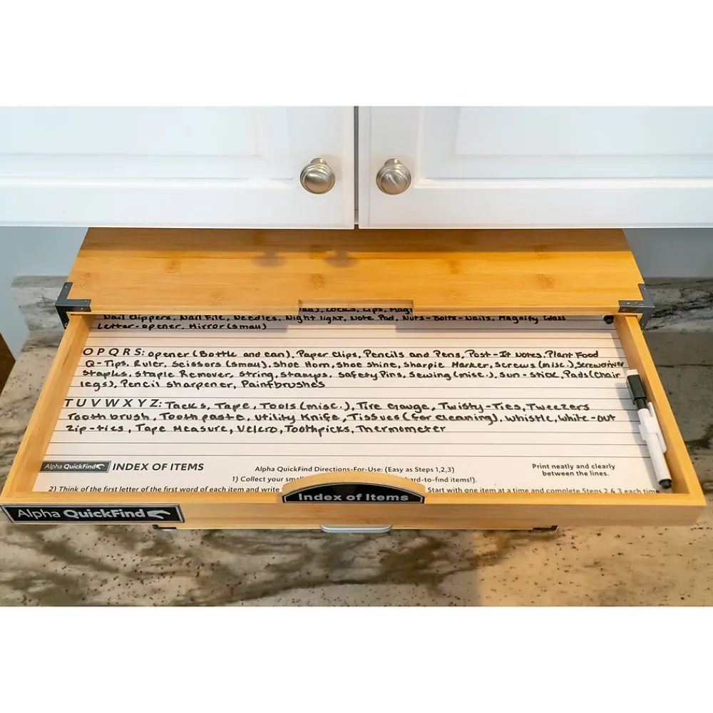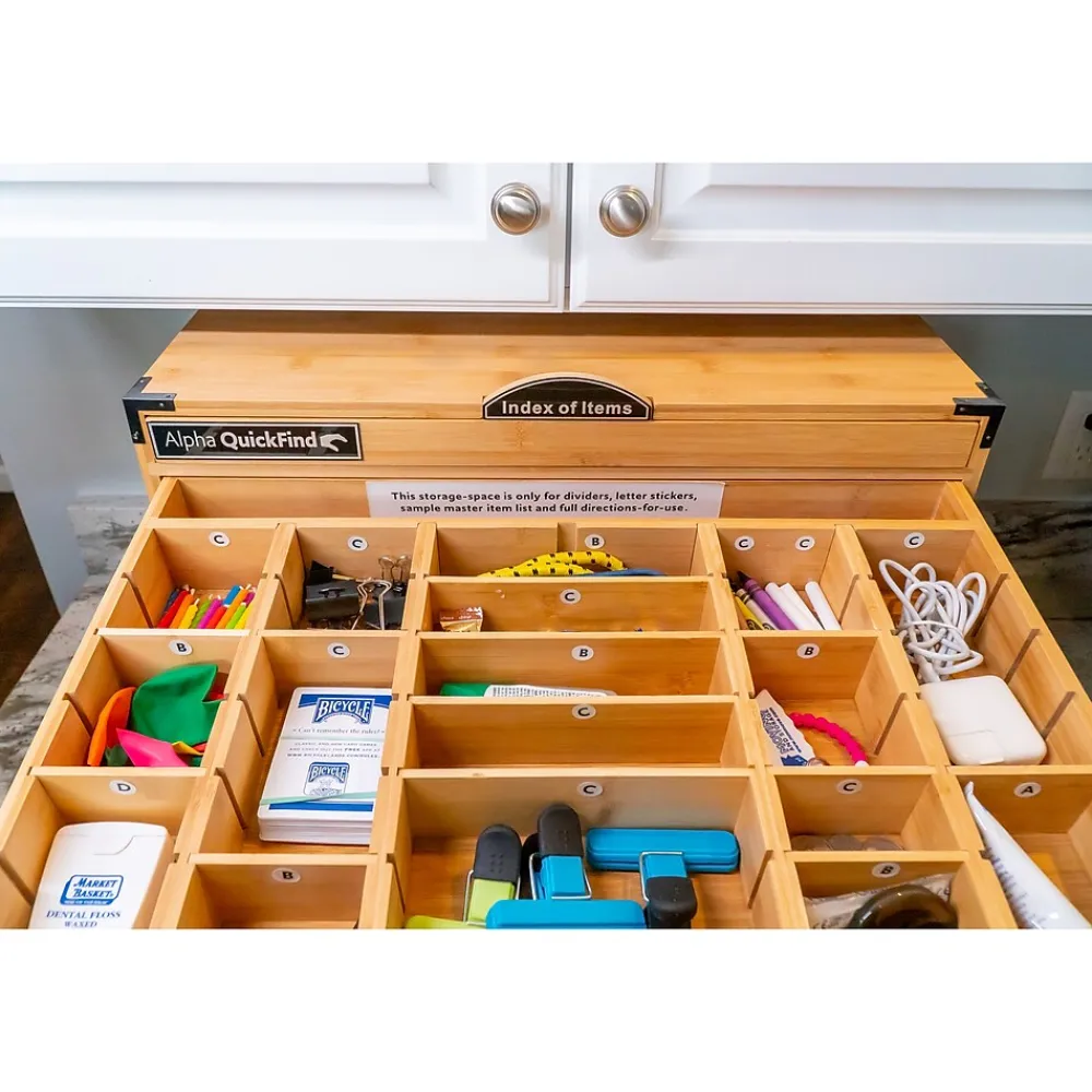 Today’s organizers are unorganized. It is an age-old problem that small household items get lost way too easily, and they are just stored in many unorganized junk drawers all around your house. Alpha QuickFind is a well-thought-out system for all your easy-to-lose minuscule items. If you are ever having issues finding any small household items, this 100% bamboo cabinet (not for outdoor use) comes with this complete organizing system built-in for you. Simply, make life easier for yourself and others when every item has its own specific place.