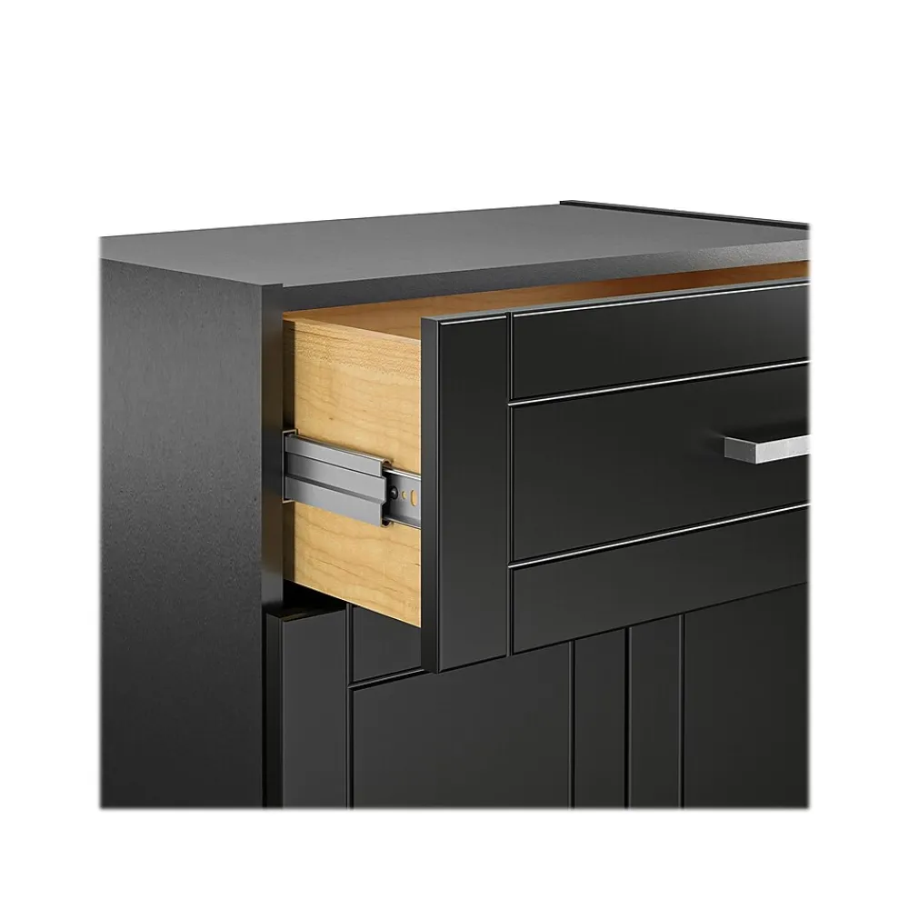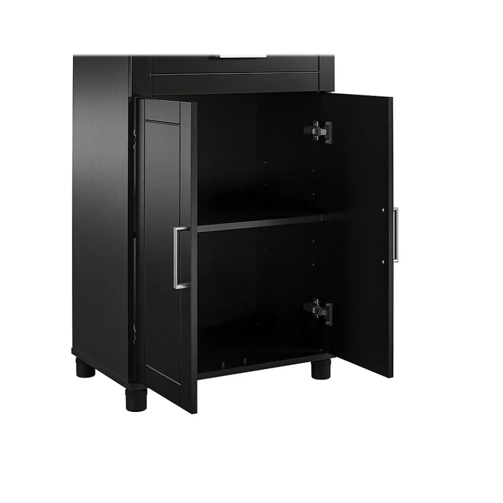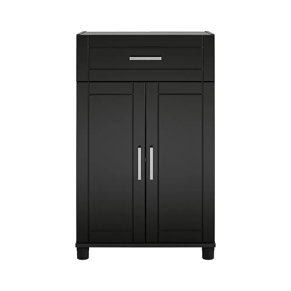 Add convenient storage space to your home with the Ameriwood Callahan storage cabinet. This base cabinet features a top drawer for easy access to contents. Behind the two doors, you’ll find one adjustable and one fixed shelf. The storage cabinet features a water-resistant black finish that creates a refined, clean look in your home. The base storage cabinet ships flat to your door and requires assembly upon opening. Two adults are recommended to assemble.