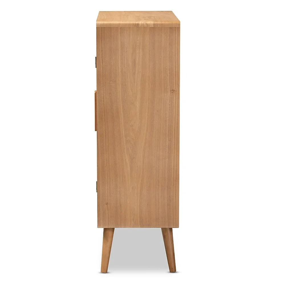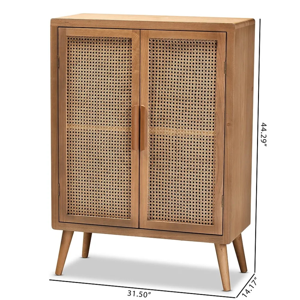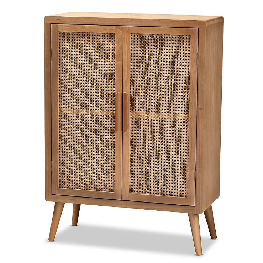 Cultivate a fresh, retro feel in any space with the Alina cabinet. This sturdy wood cabinet showcases a medium oak finish for a look that’s both warm and inviting. Two shelves, behind two doors, provide ample space to keep items organized and out of sight. Woven rattan adds a cool, bohemian vibe, while angled legs and long wooden handles lend mid-century charm. The Alina cabinet is made in China and requires assembly.This is a product of nature and may have variations in areas such as, but not limited to, color, pattern, grain and texture. The hair-like strands of rattan/rattan-fiber are common due to nature of the material.