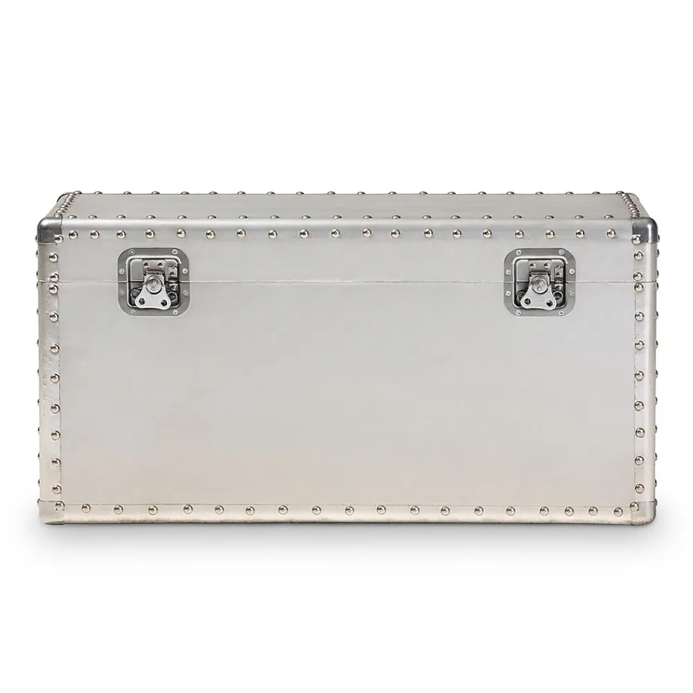 Add cool, vintage industrial-inspired storage to your space with the Serge trunk. Constructed from metal, the Serge features a spacious inner storage compartment. Modeled after antique steamer trunks, the Romain is accented with silver metal handles and imitation locks. Rivets add an extra dose of industrial style. Use the Serge to store extra blankets, pillows, and more. The Serge trunk is made in China and will arrive fully assembled.