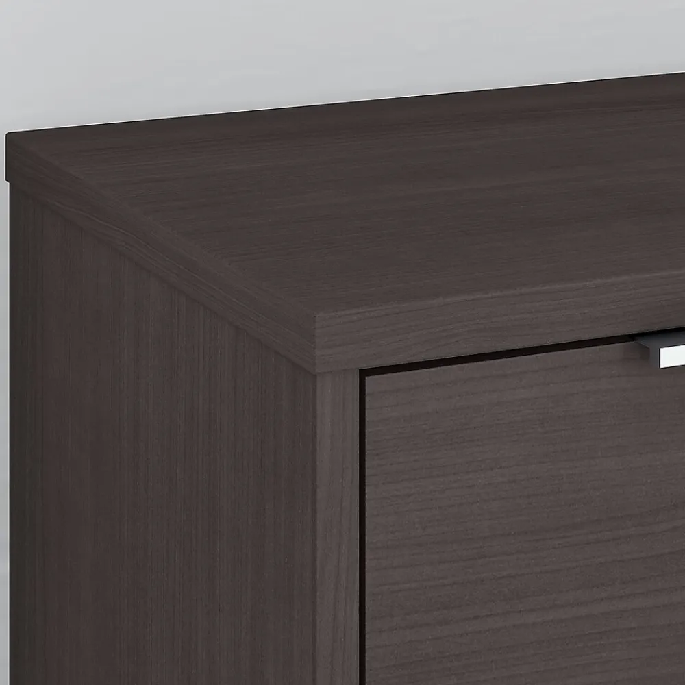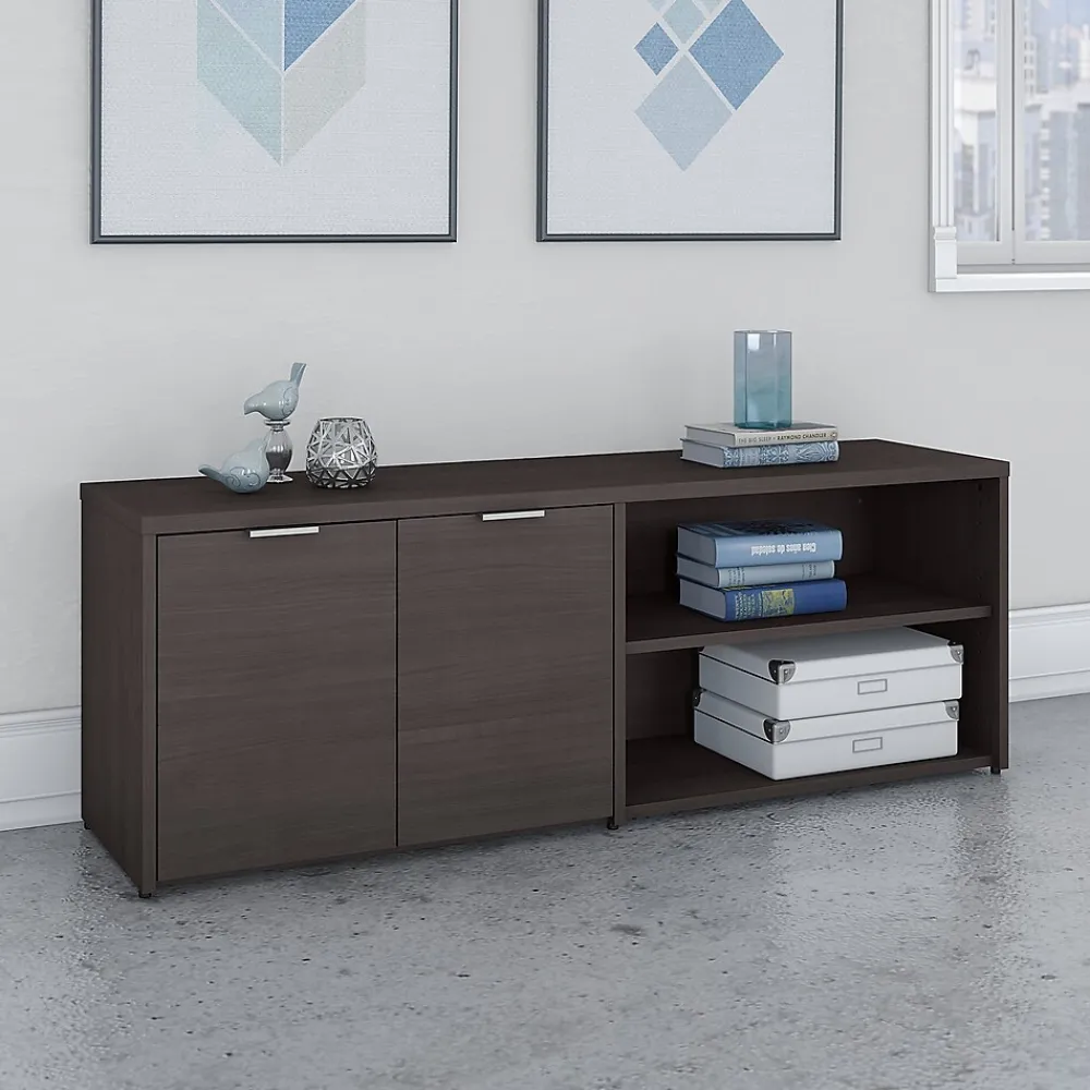 Use the Bush Business Furniture Jamestown low storage cabinet with doors and shelves to organize supplies anywhere in your office or to build an L-shaped desk. Featuring a multipurpose design that’s both stylish and practical, the Bush Business Furniture Jamestown low storage cabinet with doors and shelves makes a great addition to any modern professional office. This versatile organizer can be used on its own as a storage credenza or as a return to form an L-shaped desk with coordinating 60″W and 71″W work surfaces (sold separately). Open and closed compartments each include one adjustable shelf to accommodate a variety of materials and decorations. Named in honor of Bush Business Furniture’s Western New York headquarters, the Bush Business Furniture Jamestown collection celebrates both the brand’s heritage and its commitment to providing solutions that meet the evolving needs of professional offices. This commercial-grade storage cabinet is tested to meet ANSI/BIFMA standards for safety and performance and is backed by a 10-year warranty. American-made with US and imported parts.