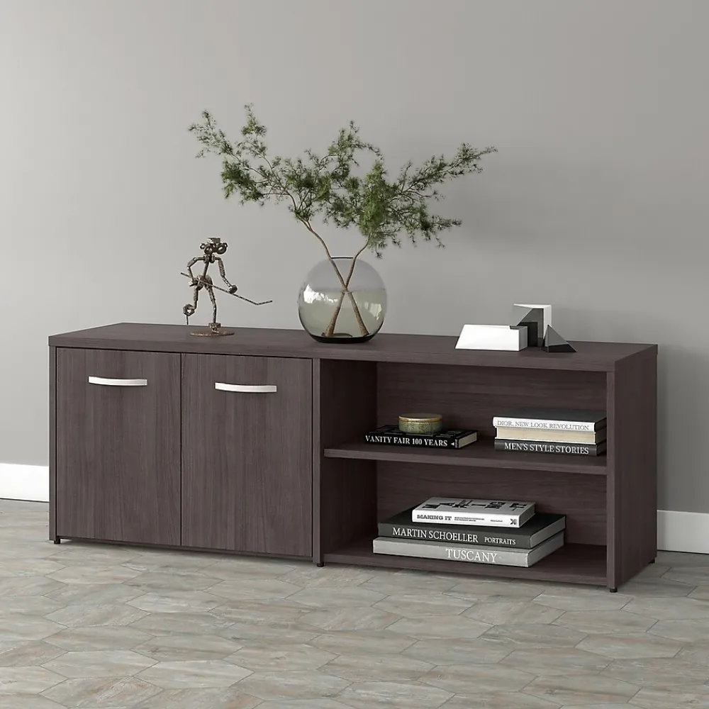 The Bush Business Furniture Studio A low storage cabinet with doors and shelves combines a fresh contemporary appearance with the commercial-quality construction needed to withstand years of everyday use. The open and closed compartments each include one fixed shelf and one adjustable shelf to accommodate everything from books and reference materials to decorations. Each shelf supports up to 50 lbs., so storing and displaying larger items is never an issue. The surface of the storage credenza can be used as a practical place to keep a small printer and other equipment or to give your workspace a personal touch with plants, pictures, and more. This office credenza storage cabinet with shelves has been meticulously tested to meet or exceed the ANSI/BIFMA quality standards for safety, durability, and performance and is backed by a 10-year manufacturer limited warranty. American-made with US and imported parts.