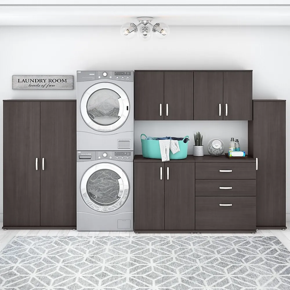 - Bundle includes: tall storage cabinet with doors, tall narrow storage cabinet, floor storage cabinet with doors, floor storage cabinet with drawers, set of two wall cabinets with doors