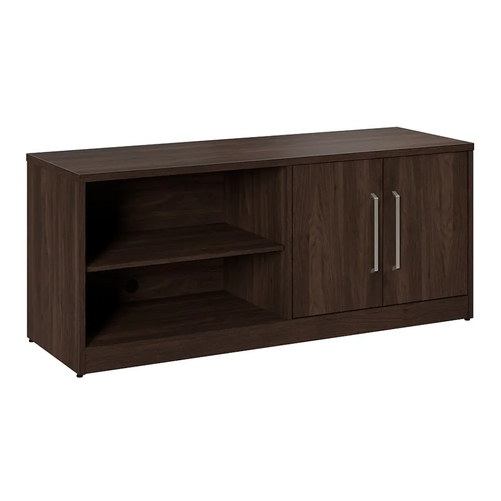 The Vista Low Storage Cabinet with Doors and Shelves keeps any office or workspace organized and clutter-free, adding a modern touch and extra storage where it’s needed. Its durable 1-inch thick thermally fused laminate surface resists scratches and stains while supporting up to 200 pounds Doors feature smooth self-closing, Euro-style hinges and can be mounted on either side. Credenza offers one fixed and one adjustable shelf in both the open and closed storage areas. Thoughtfully designed for maximum stability and includes an optional wall anchor and adjustable levelers for additional peace of mind. Available in several finishes with brushed nickel hardware. Bush Business Furniture’s commitment to safety includes rigorous testing that meets or exceeds ANSI/BIFMA x5.5 commercial test standards. Backed by a 10 Year Warranty and made in North America with globally sourced materials.