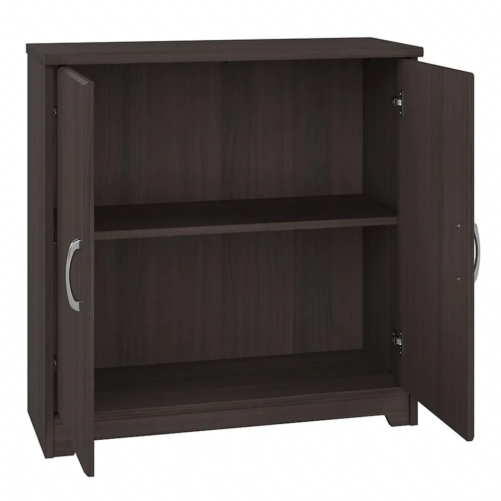 The Bush Furniture Cabot small storage cabinet with doors presents a home office storage solution with transitional style. Featuring a design that’s as versatile as it is practical, this two-door cabinet is a perfect way to organize work materials, a collection of books or other media, miscellaneous household items, and more. One shelf is fixed, while the other can be adjusted to accommodate items of various sizes. Each shelf supports up to 50 lbs., so storing larger materials and equipment is never a problem. Cabinet doors open and close on smooth Euro-style hinges for effortless access to contents. The stable design also includes wall attachment hardware for family-friendly safety in any home office or living space. This small accent cabinet with doors has been rigorously tested to meet or exceed the ANSI/SOHO quality standards for safety and performance and is backed by a 1-year warranty.