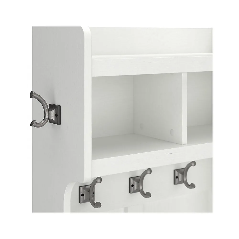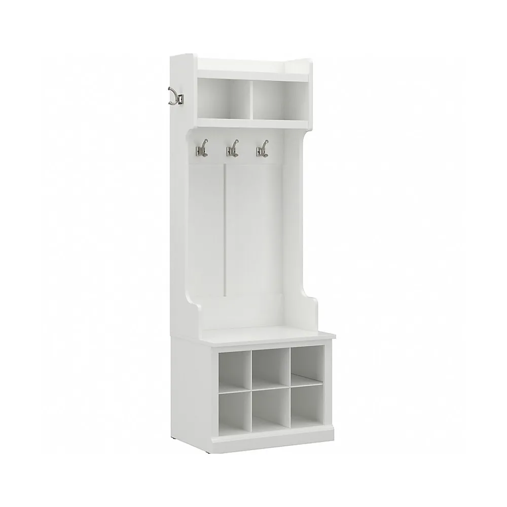 The Bush Furniture Woodland 24W Hall Tree and Small Shoe Bench with Shelves combines transitional styling and a practical design to offer an ideal entryway organizer. Have a seat on the durable bench and take a moment to relax as you get ready to head out the door or come home after a long day. The top of the mudroom bench supports up to 250 pounds, so you can sit down to put on and take off your shoes or set bags down with confidence. Six built-in cubby spaces keep your home organized while providing easy access to footwear. The narrow Hall Tree features three coat hooks in the front and one on each side for hanging jackets, hats, and more. Smaller items like gloves and keys can be stashed inside two open compartments. This entryway bench with storage has been rigorously tested to meet Bush Furniture’s standards for safety, performance and durability and is backed by a 3 Year Warranty.