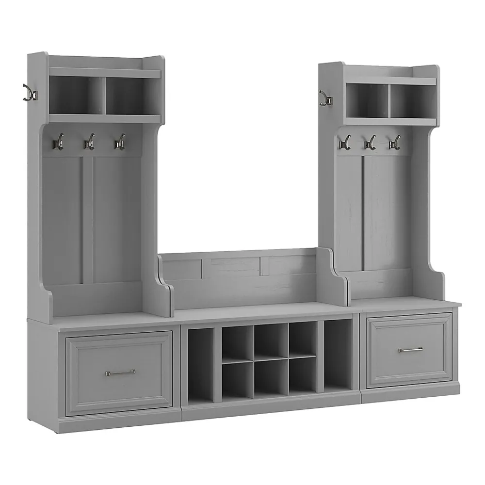 The Bush Furniture Woodland Entryway Storage Set with Hall Trees and Shoe Bench with Drawers combines transitional styling and a practical design to offer an ideal organization solution. Have a seat on the durable storage bench and take a moment to relax as you get ready to head out the door or come home after a long day. Each section of the long mudroom bench supports 250 pounds, so you can sit down to put on and take off your shoes with confidence. Vertical and cube shelving along with two small drawers to the left and right accommodate footwear and accessories for a clutter-free entryway, mudroom or foyer. The narrow hall trees include three coat hooks in the front and one on each side for hanging jackets, hats, and more. This entryway bench and coat rack set has been tested to meet Bush Furniture’s standards for safety, performance and durability and is backed by a 3 Year Warranty.