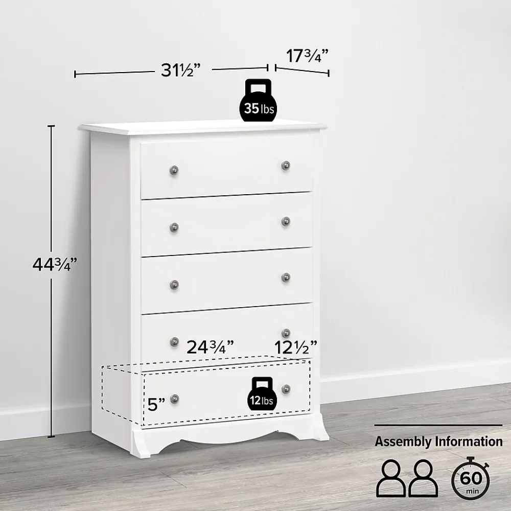 Prepac Monterey 5-drawer chest in white finish is constructed from CARB-compliant laminated composite woods which give an elegant look to any room. Drawer chest has a sturdy top to pile on your books, cell phone, alarm clock, lamp and more.