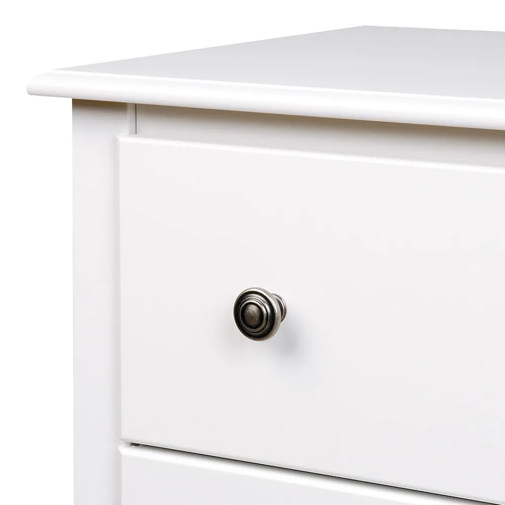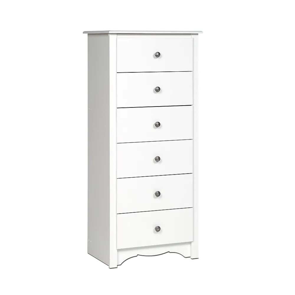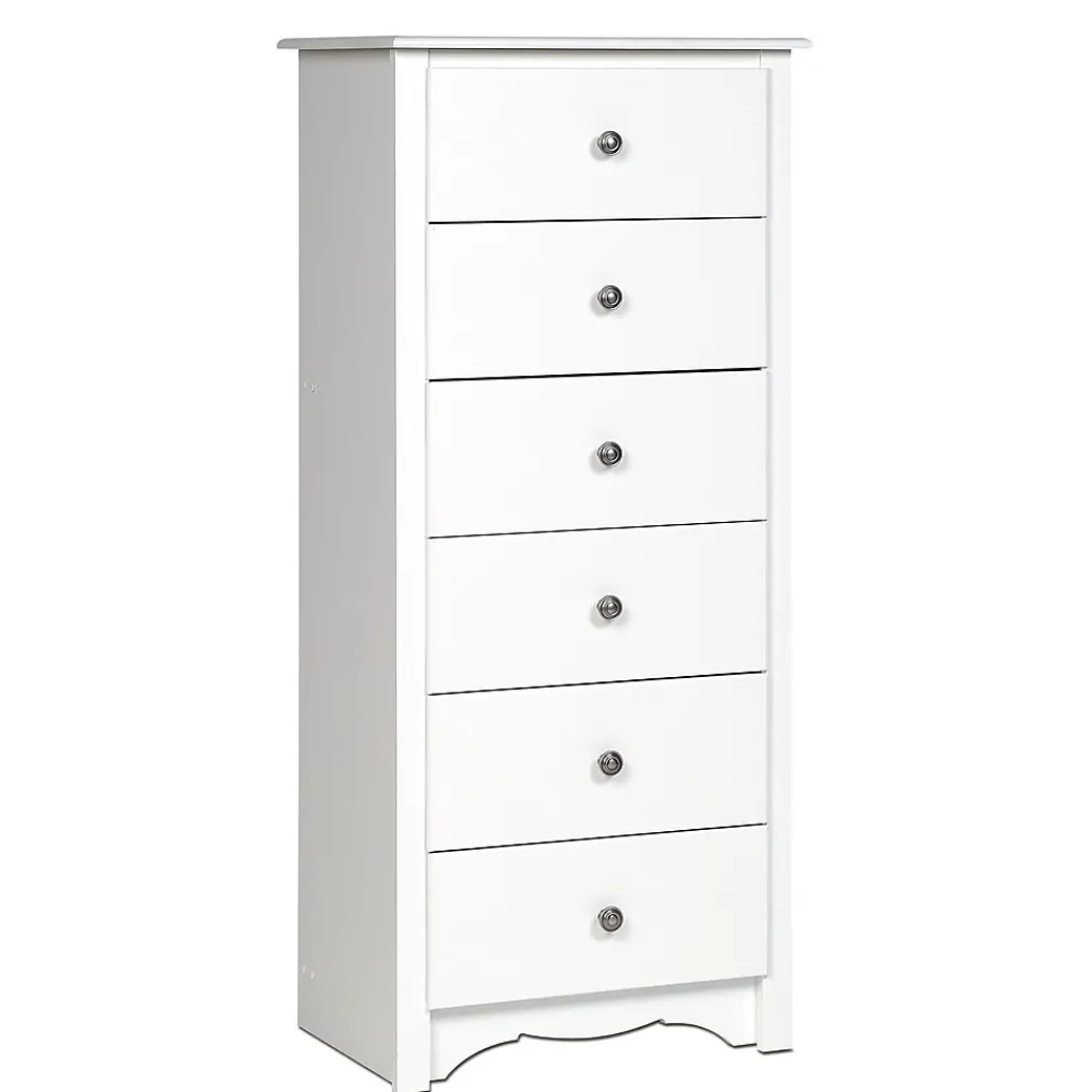Prepac™ Monterey tall 6-drawer chest in white finish is constructed from CARB-compliant laminated composite woods which give an elegant look to any room. Drawer chest has a sturdy top to pile on your books, cell phone, alarm clock, lamp and more.