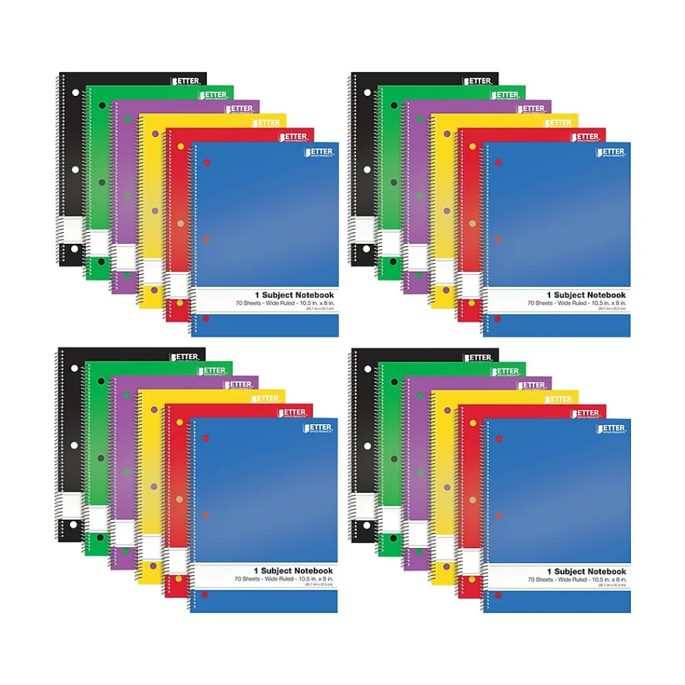 Whether you need notebooks for school, home, or office use, Better Office offers quality products at superb value. These spiral-bound notebooks come in six solid colors: black, blue, red, yellow, green, and purple (four of each color). Sturdy paperboard front and back covers protect your notes and provide a sturdy surface when fixed surfaces aren’t handy. The notebooks are three-hole punched to fit a standard-size three-ring binder with a snag-free coil binding. The sheets feature wide ruling in blue and are perforated along the left margin for easy removal.