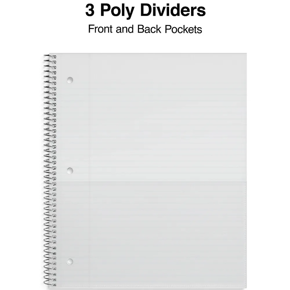 Protect important notes from water damage by using this poly-cover notebook. A wire binding makes it easy to flip between pages and also helps prevent snagging. College-ruled spacing maximizes space for notes, while the pages are also micro-perforated for easy removal. This Staples Accel three-subject notebook features dividers for categorization of notes, ideal for school, work or home projects. This is an individual notebook that may come in a variety of colors. The color shipped is chosen at random, no requests can be made.