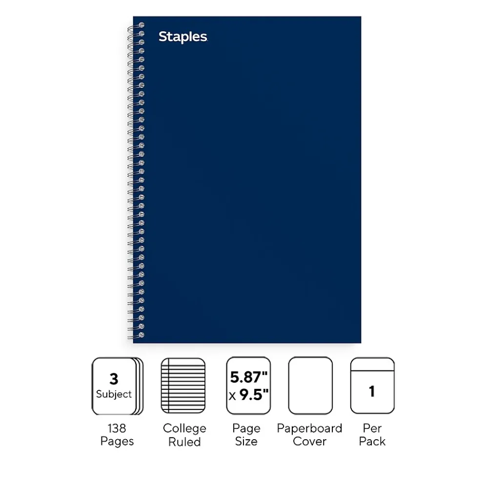 Keep a backup on hand with this 3-subject notebook. The college-ruled design ensures efficient space utilization and neat note-taking, while the twin-wire spiral spine offers easy access to the sheets inside, simplifying usage. Featuring a perforated edge, this Staples Premium 5.88 x 9.5-inch blue 3-subject notebook lets you remove the pages cleanly.