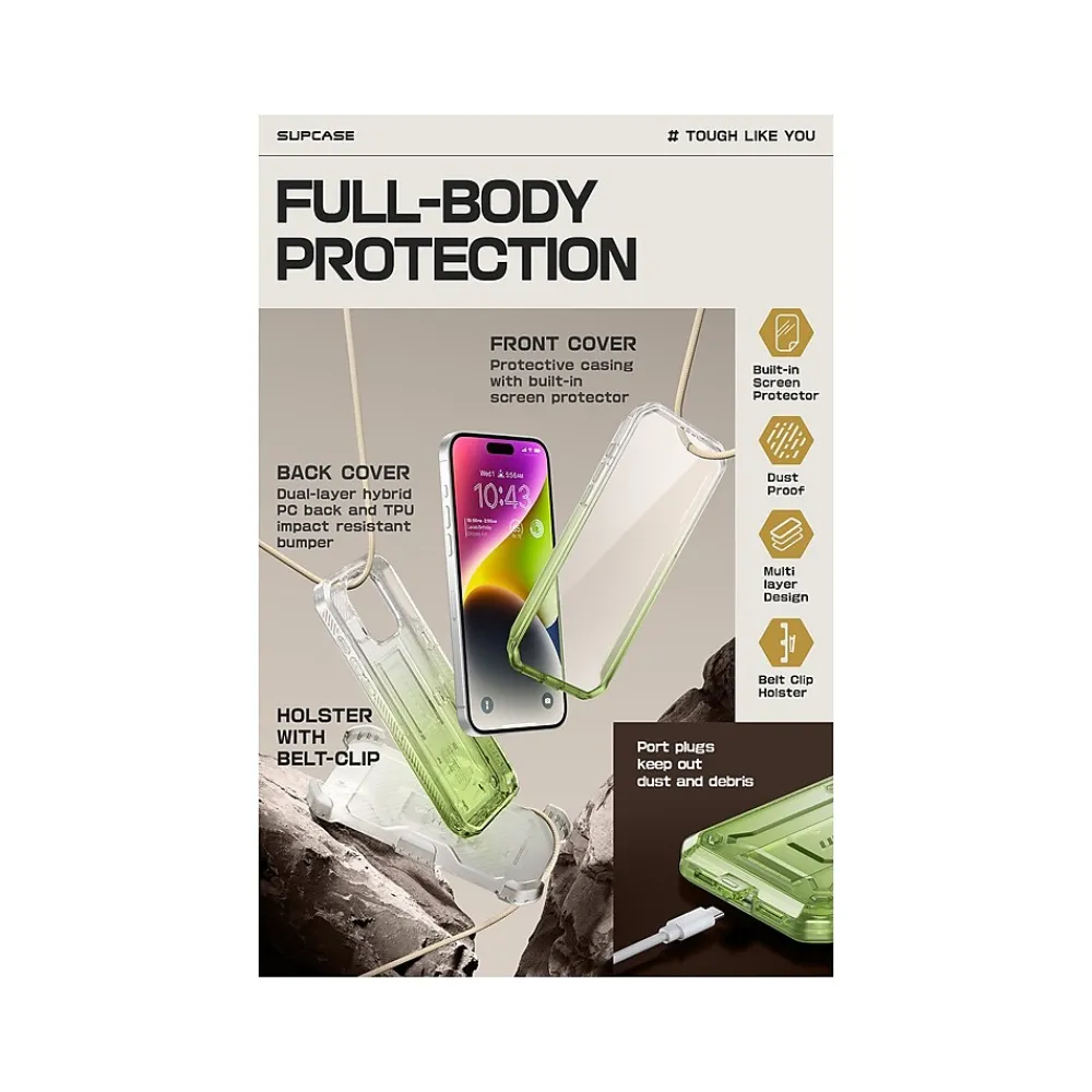 The SUPCASE Unicorn Beetle PRO rugged case ensures full-body protection for your iPhone 15 Pro Max (6.7″ screen). Features a dual-layer unbending polycarbonate back and impact-resistant TPU bumper. Port plugs keep out dust and debris.