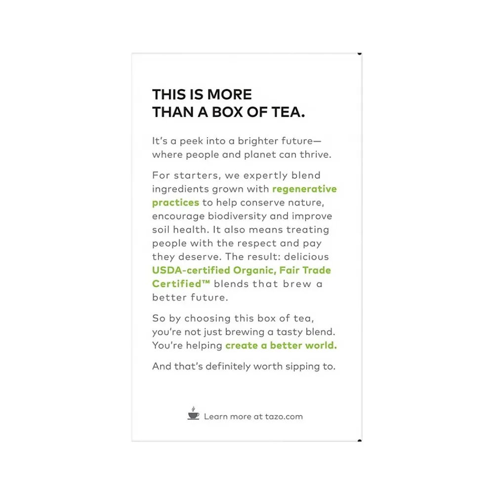 The Tazo Green Ginger regenerative organic tea is a bright green tea with a kick of ginger spice and a burst of sweet pear notes for an unexpected twist.