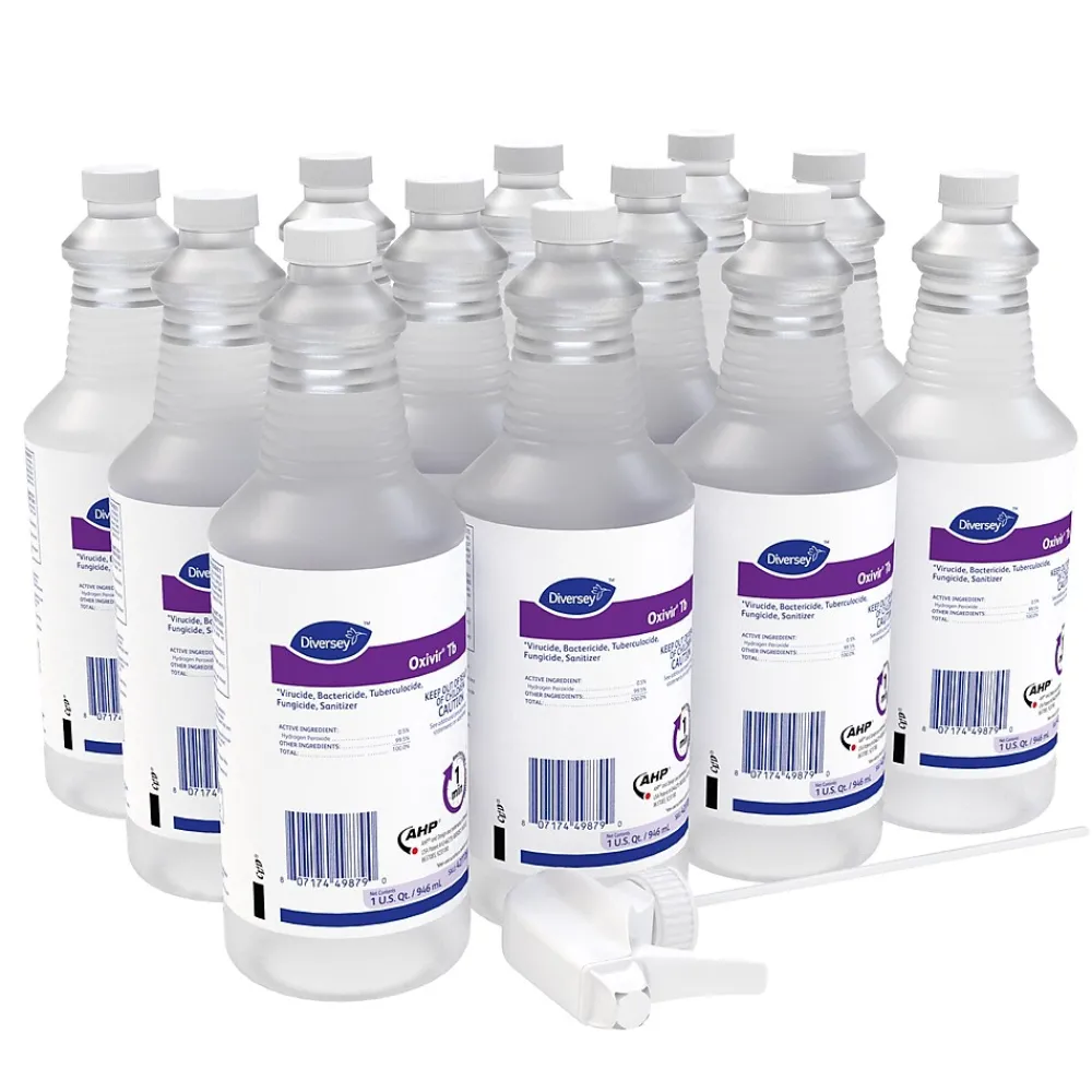 Sanitize hard and soft surfaces easily with this disinfectant cleaner. The patented Accelerated Hydrogen Peroxide technology works quickly affecting viruses and bacteria after one minute, and the two included nozzles make application easy. This Oxivir disinfectant breaks down into water and oxygen, making it safe and easy to wipe away.