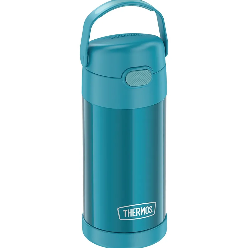 The Thermos 12 Oz. FUNtainer Stainless Steel Bottle keeps drinks cold for up to 12 hours. The double wall stainless steel construction is built to handle drops, dings and assorted roughhousing. Featuring a hygienic, push-button lid, this bottle is easy to open and drink from. To clean, you can pop your Teal FUNtainer Bottle in the dishwasher; however washing by hand is recommended.