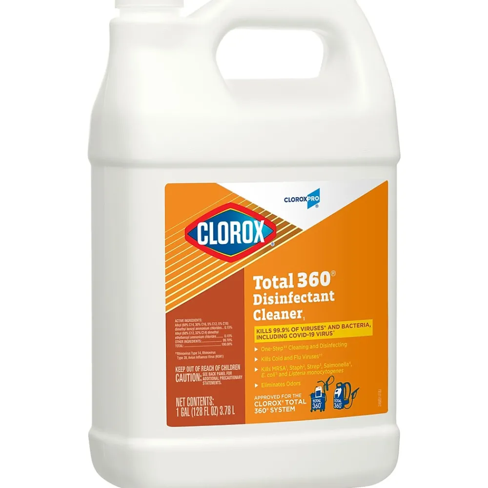CloroxPro™ Total 360® Disinfectant Cleaner is designed to be paired with the Clorox® Total 360® Electrostatic Sprayer to clean, disinfect and deodorize. This disinfectant cleaner kills 99.9% of bacteria in 5 seconds and is EPA registered to kill 44 organisms including cold and flu viruses (Rhinovirus, Influenza A), Methicillin-resistant Staphylococcus aureus (MRSA), Norovirus, Salmonella enterica, Pseudomonas aeruginosa, Staphylococcus aureus (Staph) and Vancomycin-resistant Enterococcus faecium (VRE) in 2 minutes. The disinfecting cleaner meets EPA criteria for use against SARS-CoV-2, the virus that causes COVID-19. Safe to use on a variety of hard non-porous surfaces such as porcelain, stainless steel, tile, plastic, and other nonfood contact surfaces (when use as directed). It eliminates odors, inhibit the growth of mold and mildew for up to 7 days and sanitizes soft surfaces. CloroxPro™ Total 360® Disinfectant Cleaner is a bactericidal in the presence of organic soil (5% blood serum). Approved for use with the Clorox ® Total 360® Electrostatic Sprayer and intended for use with schools, athletic facilities, offices, healthcare facilities, public restrooms, hotels, airports, ambulances, daycare centers, and institutional kitchens. CloroxPro™, where clean means everything. Packaging may vary.