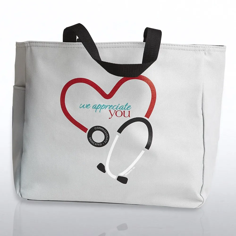 Baudville® Tote bag features stethoscope design for the theme “We Appreciate You” and handles of 15″. Tote bag is made of heavy weight poly canvas and economic with added pockets both inside and outside to facilitate organization of things easily.