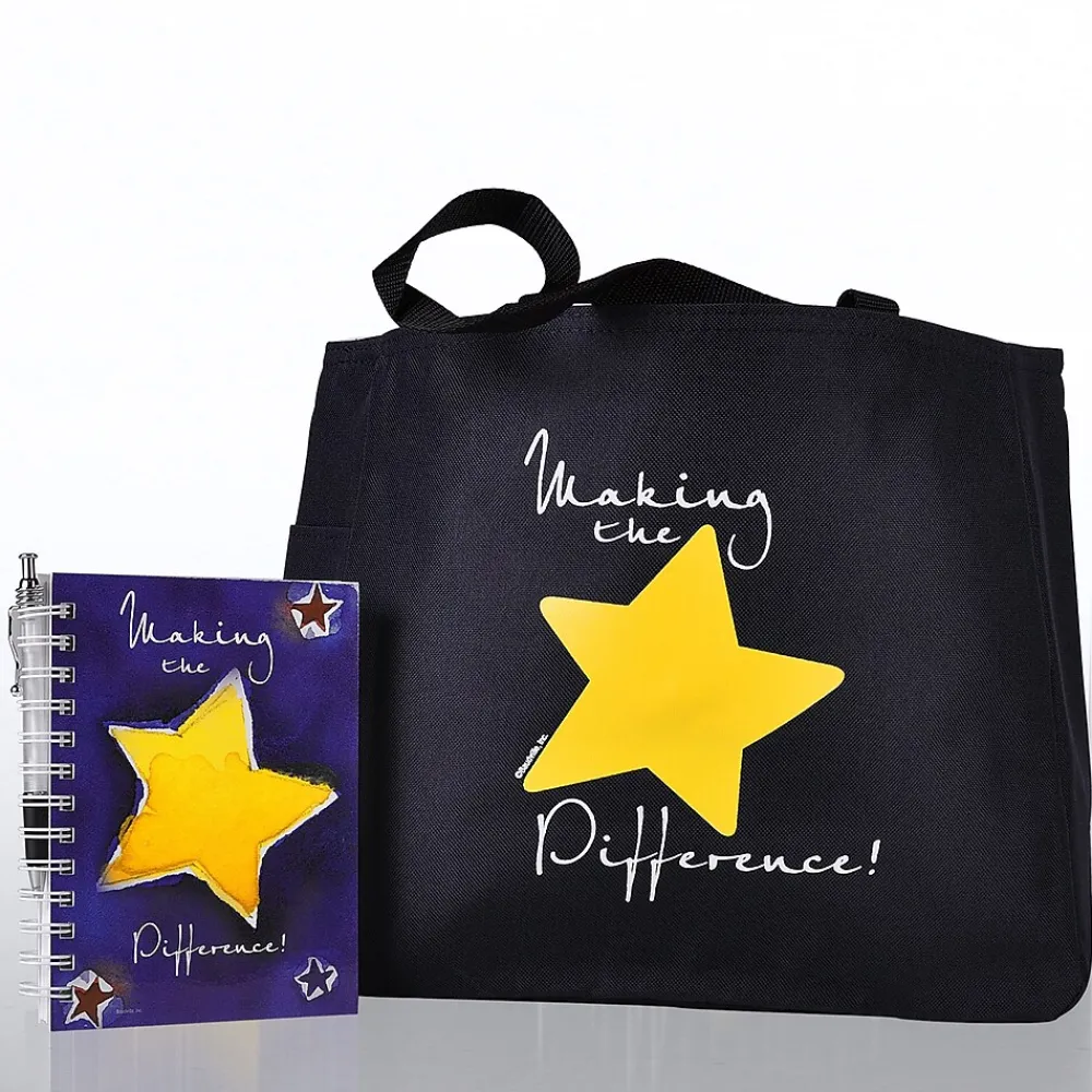 Baudville® Tote gift set has a journal of 100 pages featuring hard cover which is sleek and spiral binding. Gift set features exclusive four color art and the theme “Making the Difference” with a pen and tote made up of poly canvas material.