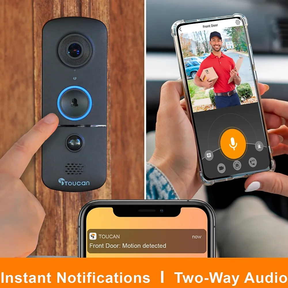 The Toucan Wireless Video Doorbell V3 – with Wireless Doorbell Chime -makes doorway security easy. The V3 uses the latest advance low powered Toucan developed PIR system for accurate motion detection. With our innovative power option using battery for a true wire free setup, and requires no hub means it is totally wire free for easy setup. Coupled with 1080p Full HD video resolution, you will always see what is happening around your home day or night.