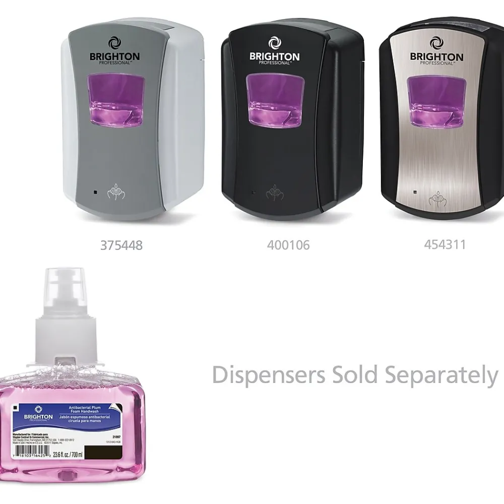 Brighton Professional touch-free refill foam soap removes grime from your hands to ensure clean work areas. The soap’s foaming action lets you clean your hands without dripping liquid on the floor, and its plum fragrance provides a pleasant bathroom atmosphere. Place these refills in touch-free dispensers in your bathroom or break room wash area to encourage good hygiene.