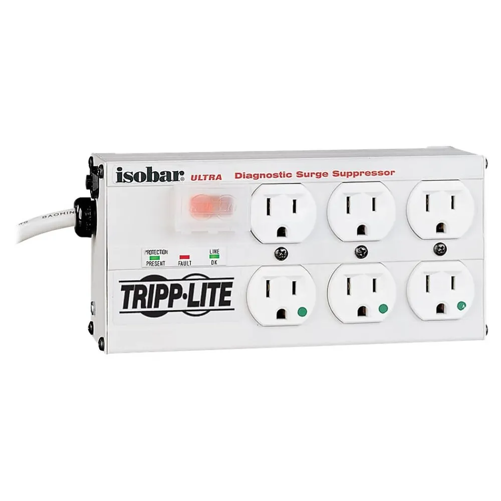Shield equipment and electronic devices with this surge suppressor. Six hospital-grade outlets are arranged in three isolated banks to avoid equipment interaction and accommodate up to three transformers. Ferrite rod-core inductors and HF/VHF capacitors with metal oxide varistors filter EMI and RFI interference to prevent data errors, system crashes, and other performance issues. The 15-foot power cord allows flexible arrangement of equipment to reach distant outlets, and safety covers protect outlets from dust while blocking unused outlets. Diagnostic LEDs in this Tripp Lite surge suppressor clearly show power, protection and line-fault status, while an automatic shutoff blocks power flow if protection circuits are compromised.