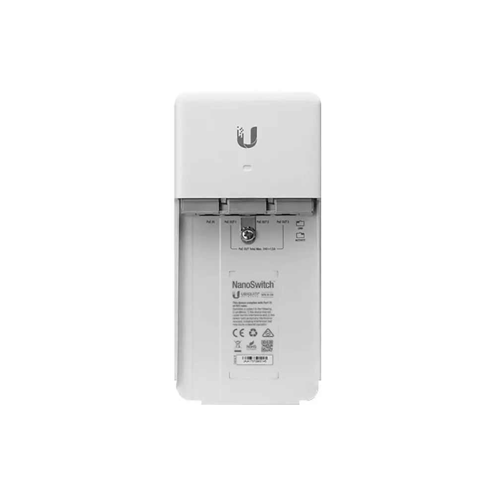 The NanoSwitch is an outdoor, four-port Gigabit switch with PoE pass-through. It is powered by 24V Passive PoE and provides up to 24W of power on three PoE out ports. The NanoSwitch is designed for outdoor deployment and supports up to 4Gbps total, non-blocking line rate.