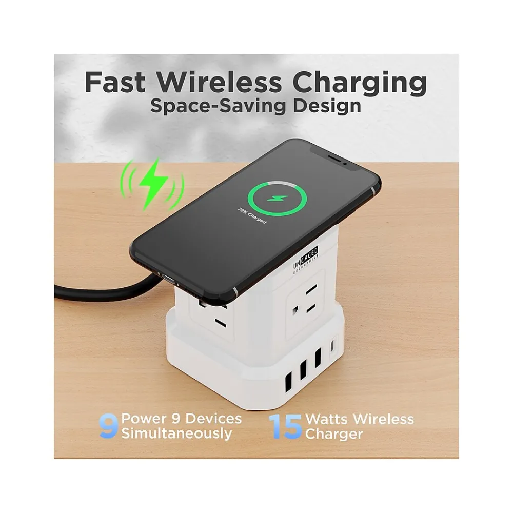 The Uncaged Ergonomics Cube surge protector power strip with USB ports delivers clean, safe, and efficient power to up to nine devices. This space-saving power strip tower features four outlets (1625W), three USB ports (2.4A), one USB Type-C (20W, fast charging), and a wireless charging pad. The 10′ extension cord gives plenty of reach to place this mountable surge protector power strip with USB ports wherever it’s most convenient. The on/off switch helps you save power without all the plugging and unplugging required of those long, clunky power strips. If you’re looking for a high-quality space-saving surge protector power strip with USB ports and a wireless charging pad, then this is the modern wall outlet extender you need.