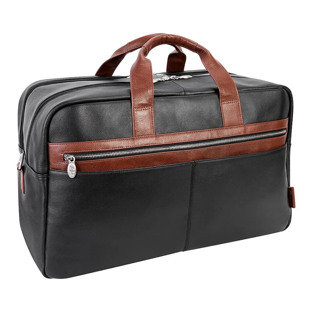 Amazingly spacious McKleinUSA U Series WELLINGTON dual-compartment carry-on duffle with elegant contrasting leather accents makes packing for important trips simple. Cellphones, keys, and other such items can be stored for easy access in the front zipper pocket with accessory organizer. Other necessary items can be stored in the front dual slip pockets. The fully lined interior with leather trim and silver hardware will keep all your valuable necessities stored safe with double anti-theft locking loop metal zippers. Clothes, files, papers, etc. can all be stored in the main compartment with enough room for a week. Keep your toiletries in the elastic pockets for simple storage. The back compartment can safely store your laptop and tablet in the secured built-in padded laptop sleeve and tablet pocket. Attach the included removable non-slip contour-padded shoulder strap, and sling the bag onto your shoulder. Unzip the back pocket to attach to any rolling case for comfortable transport, and set it down with confidence on five protective rubber feet.