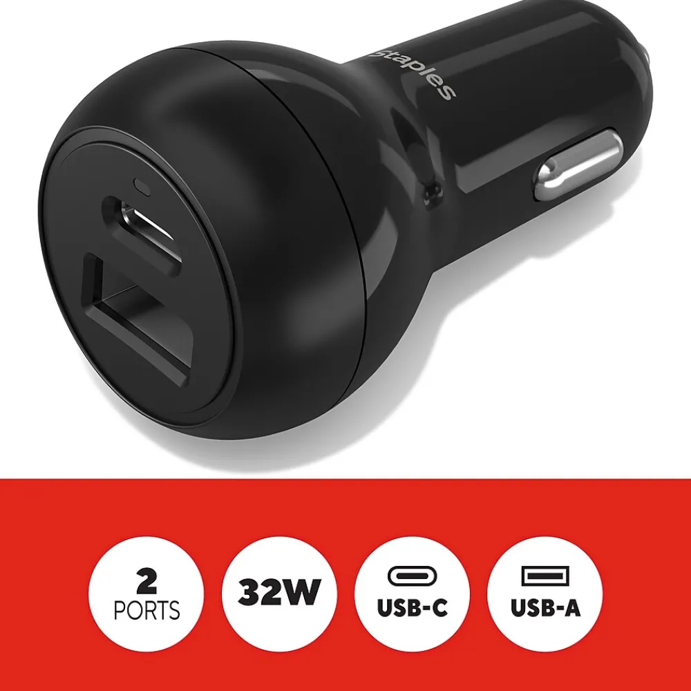 Perfect for commuters or workers on the go, this dual-port car charger features one USB-A and one USB-C port to charge two devices at once. Plug this Staples® Two-Port USB-A & USB-C Car Charger into your car’s auxiliary power outlet to power your smartphones and tablets quickly.