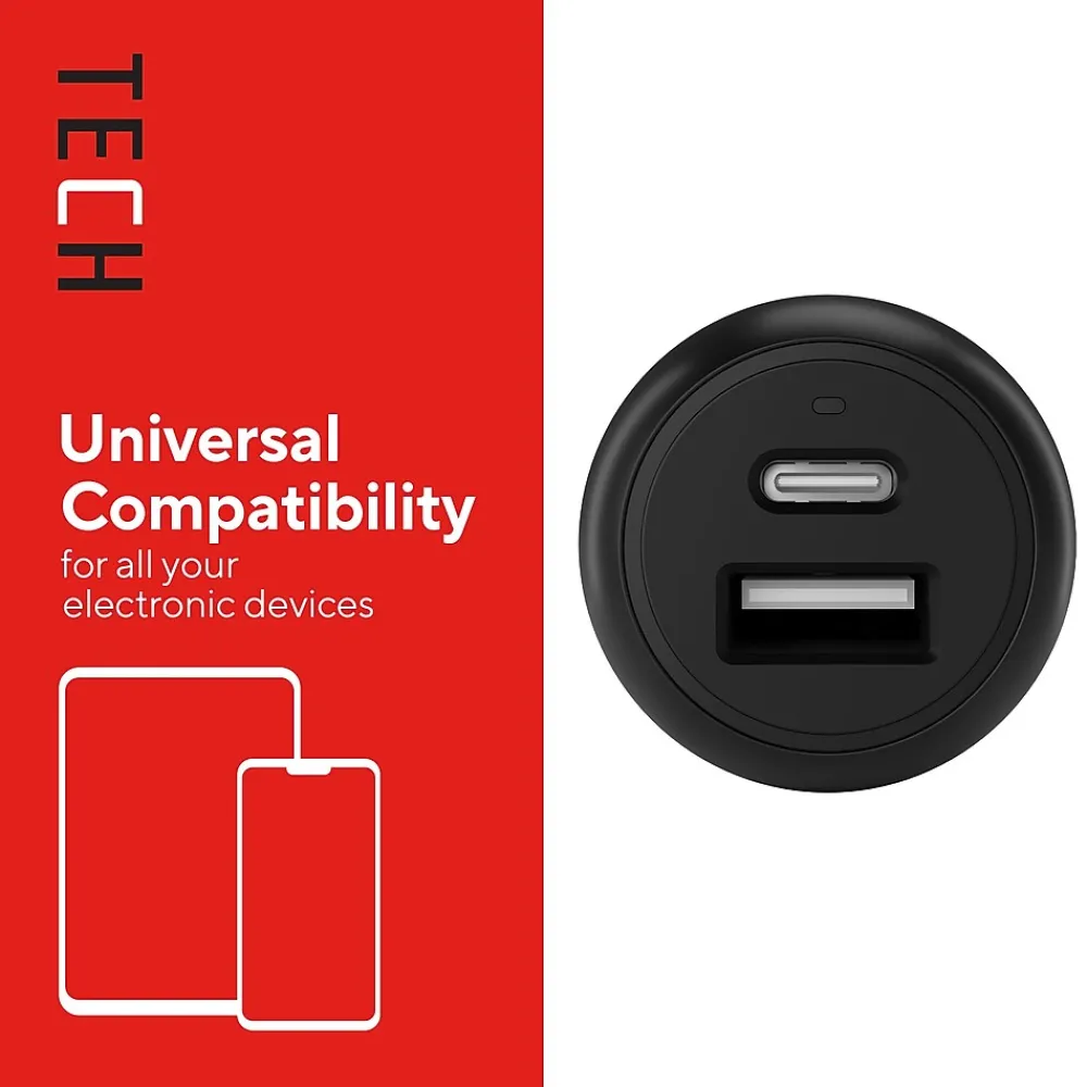 - Compact and portable black 2-port USB-A/USB-C car charger (cables sold separately)