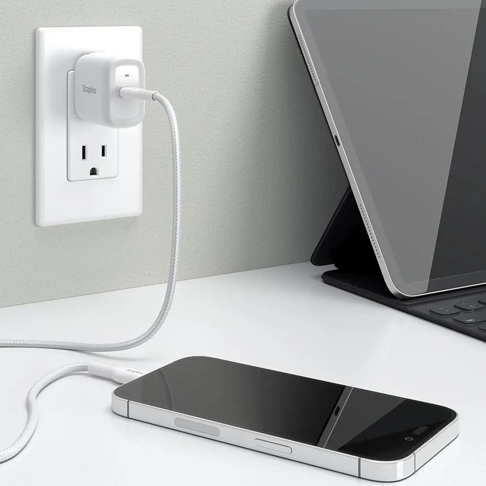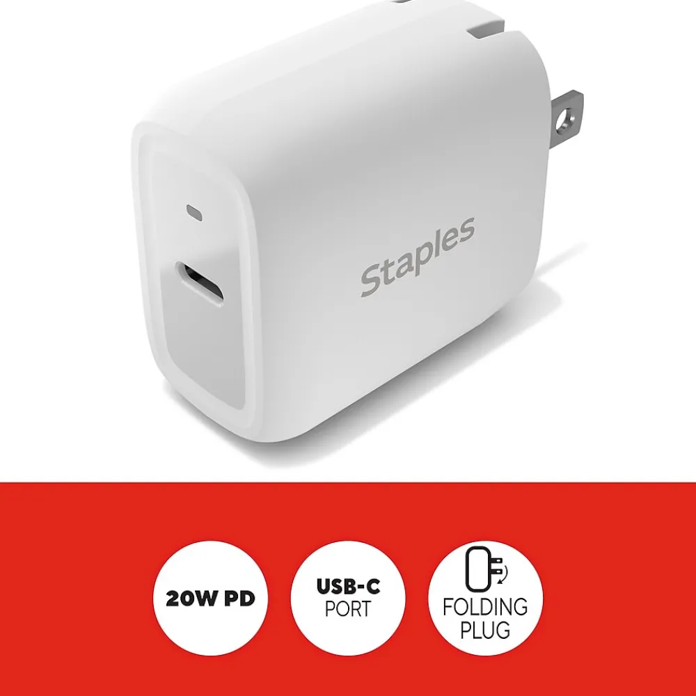 Upgrade your charger to power your smartphone, tablet and other devices with this USB-C charging port. The 20W StaplesĀ® Single-Port USB-C Wall Charger is compatible with Apple, Samsung, Google and LG smartphones and tablets. The foldable wall plug makes this charger easily portable and reduces damage to prongs.